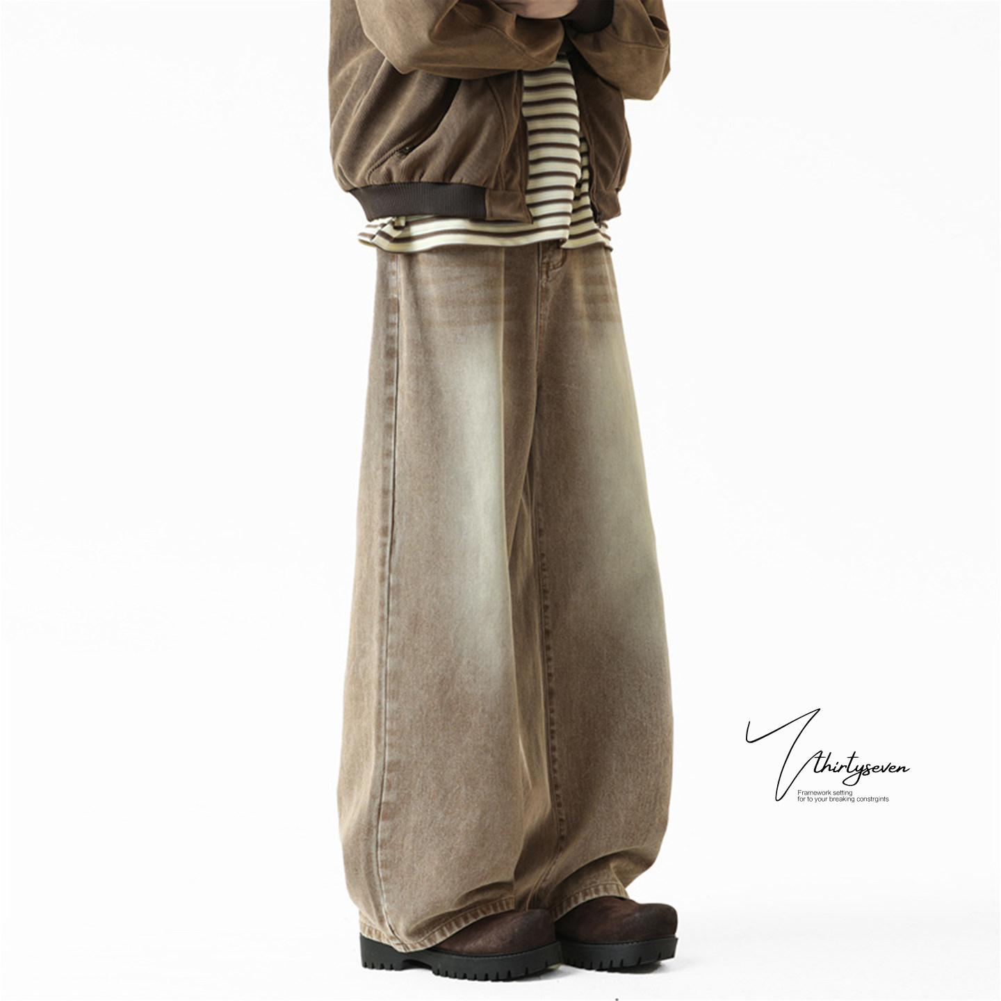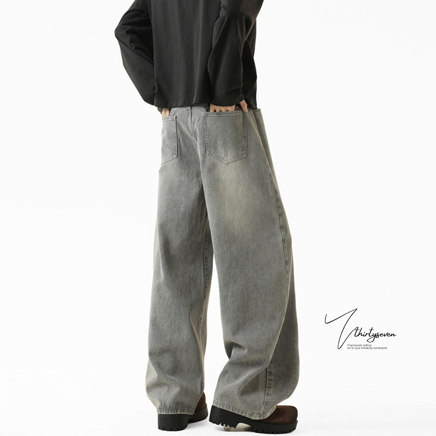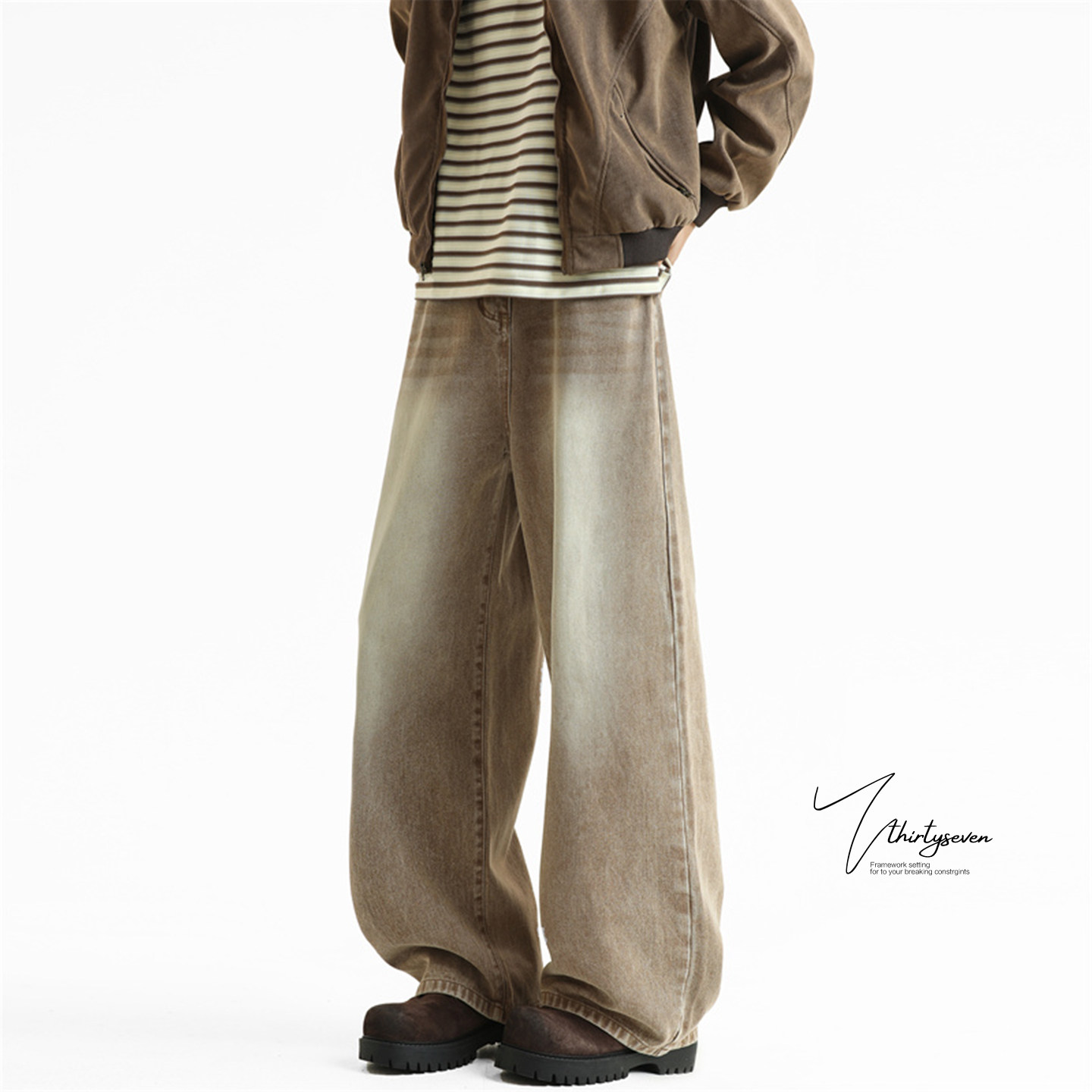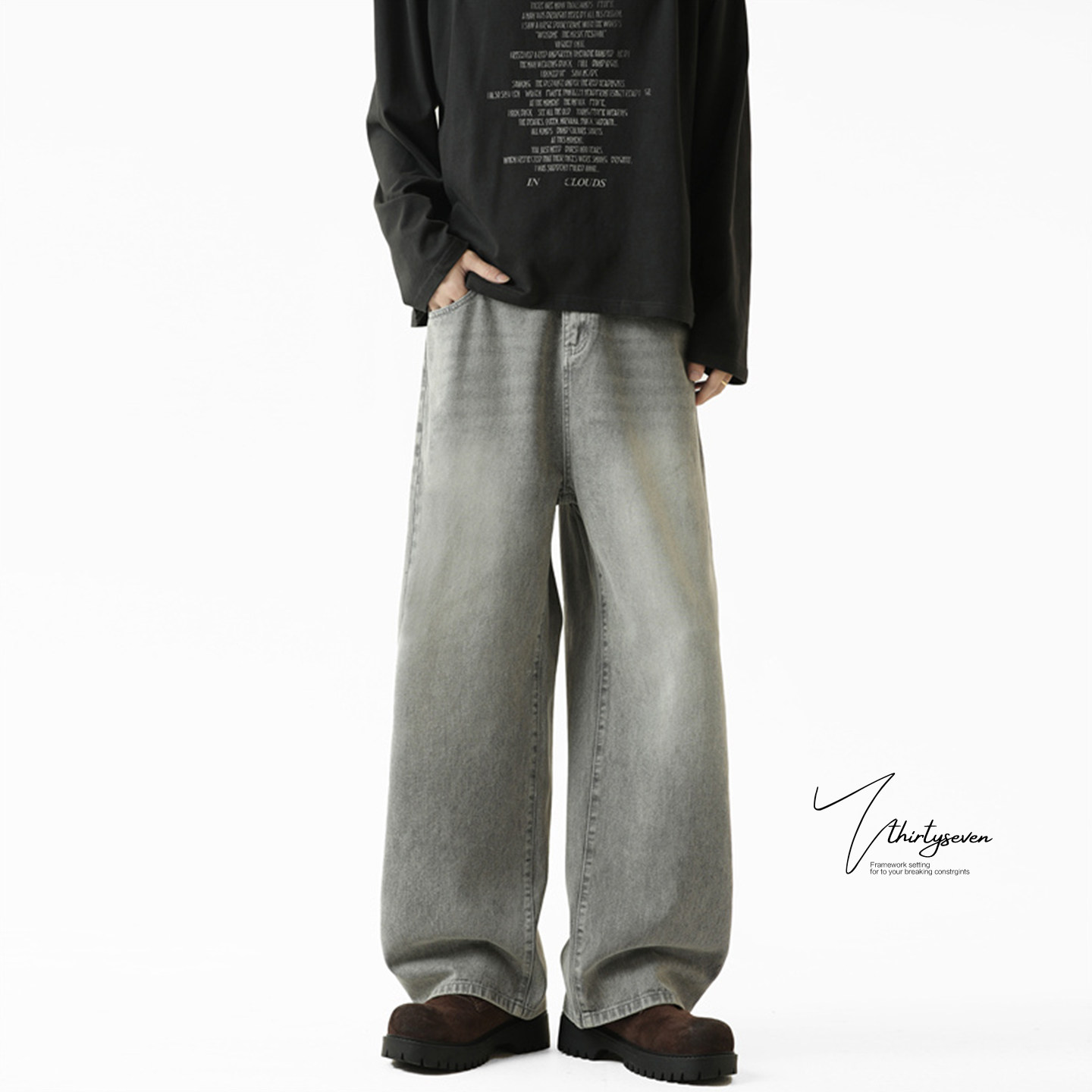 V37美式水洗做旧牛仔裤男春高街痞帅宽松阔腿裤潮牌百搭磨白裤子
