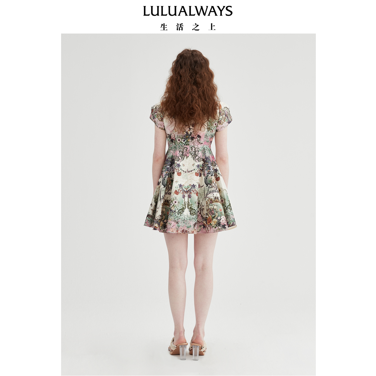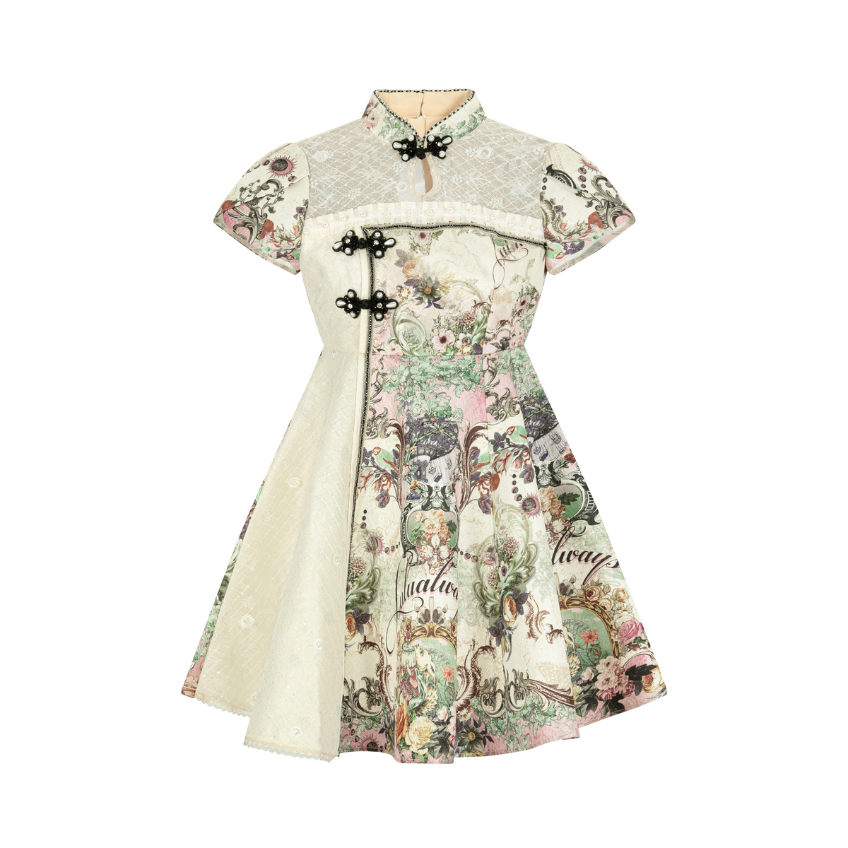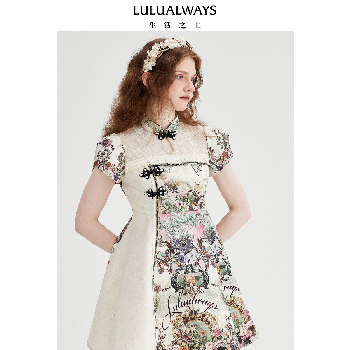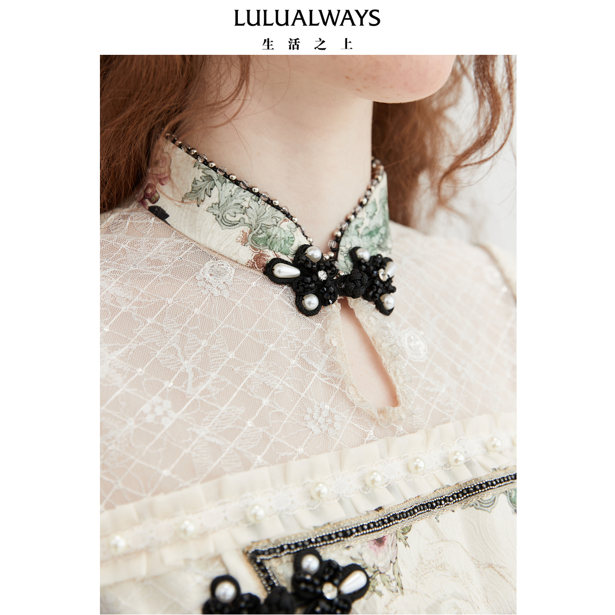 LULUALWAYS【商场同款】25夏季新款国风蕾丝拼接盘扣提花连衣裙女