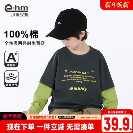 小象汉姆童装男童长袖T恤假两件儿童纯棉打底衫2025秋装新款上衣