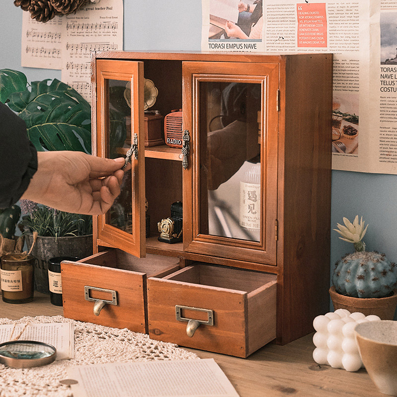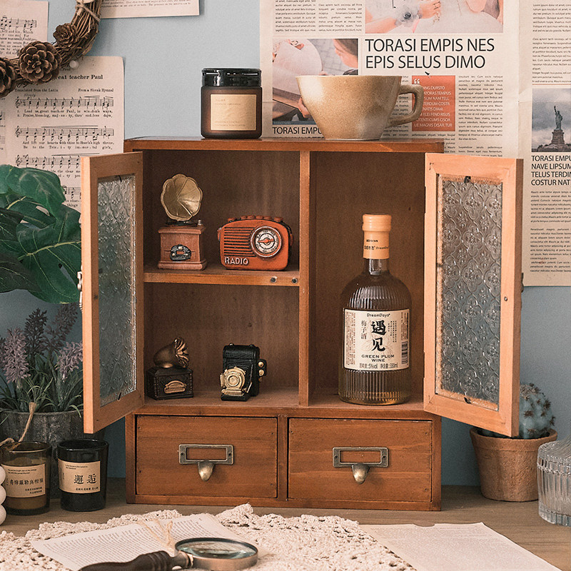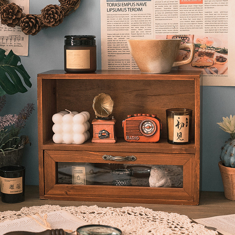 桌面杯子杂物收纳柜办公桌实木多层化妆品置物架柜复古屉式整理盒