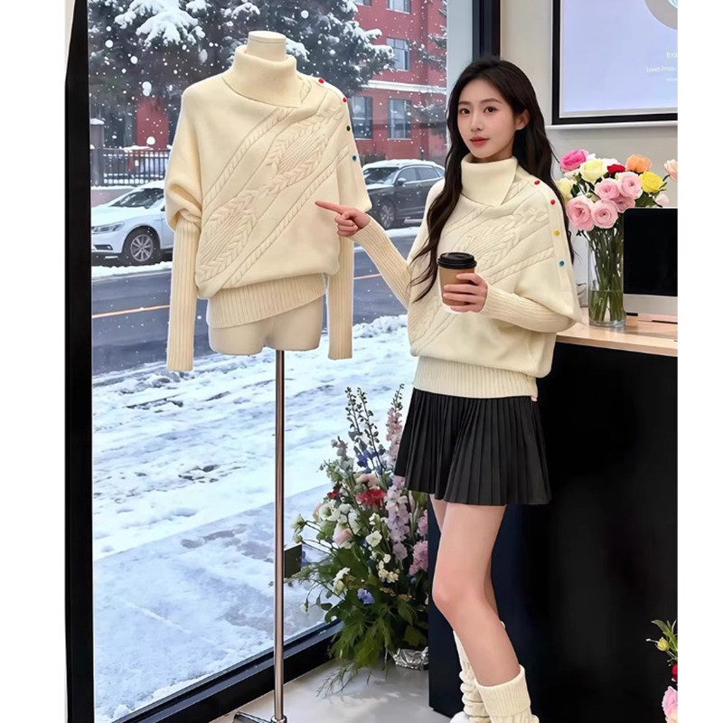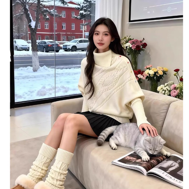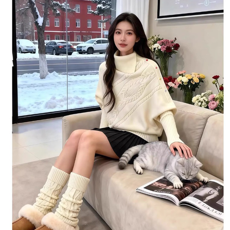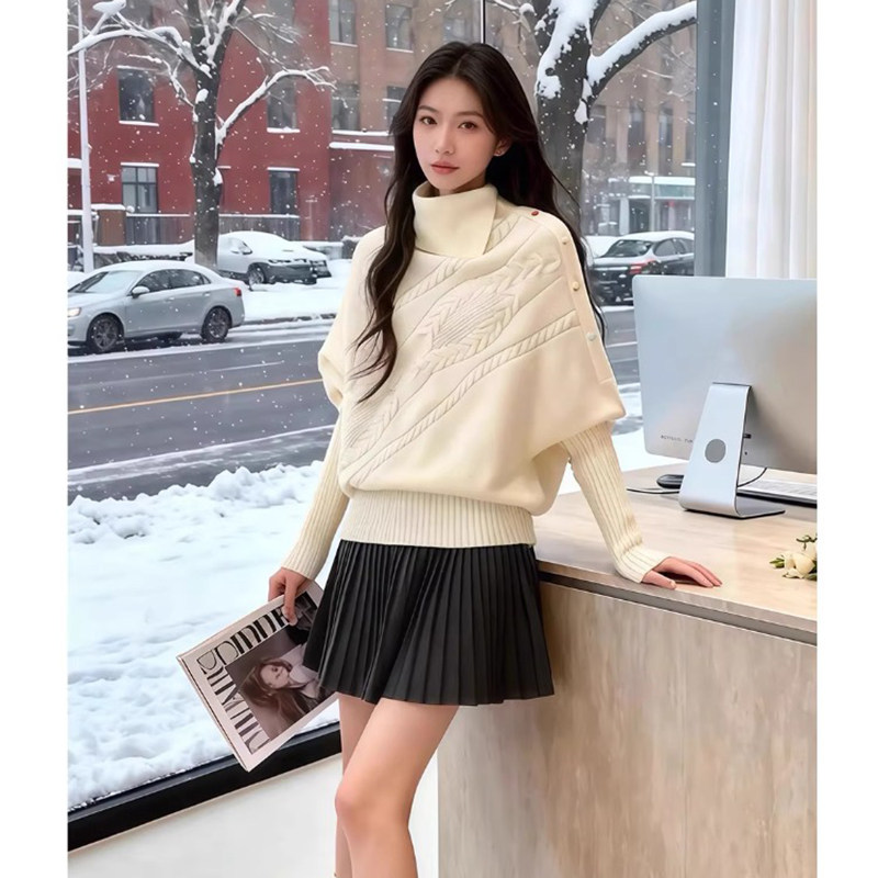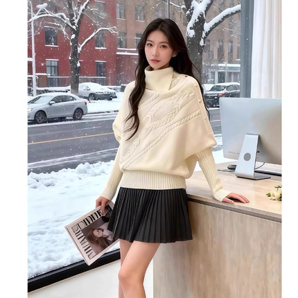 白色高领套头毛衣女秋季秋冬不规则内搭打底蝙蝠袖斗篷针织衫上衣