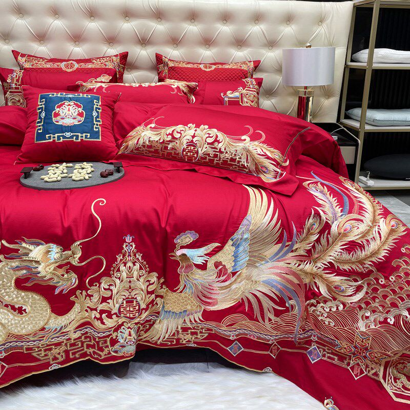 高端婚庆奢华四件套大红s色全棉龙凤刺绣床单床盖款结婚床上用品