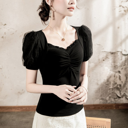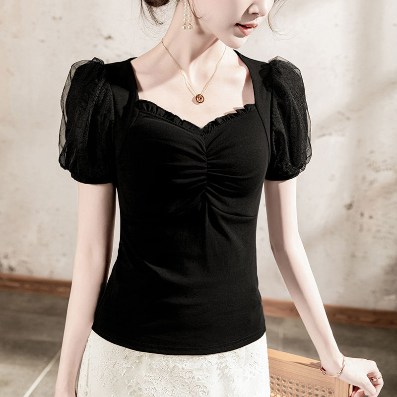 法式方领T恤女短袖网纱拼接泡泡袖2025夏季褶皱木耳边女装上衣