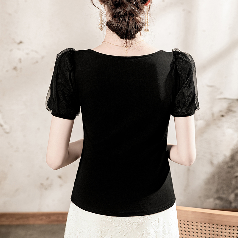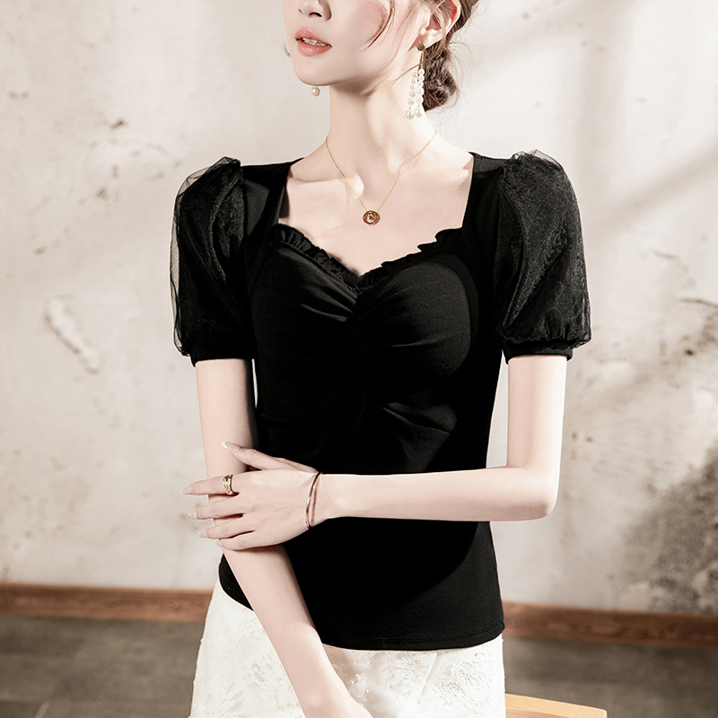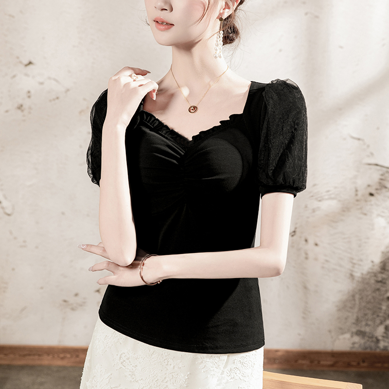 法式方领T恤女短袖网纱拼接