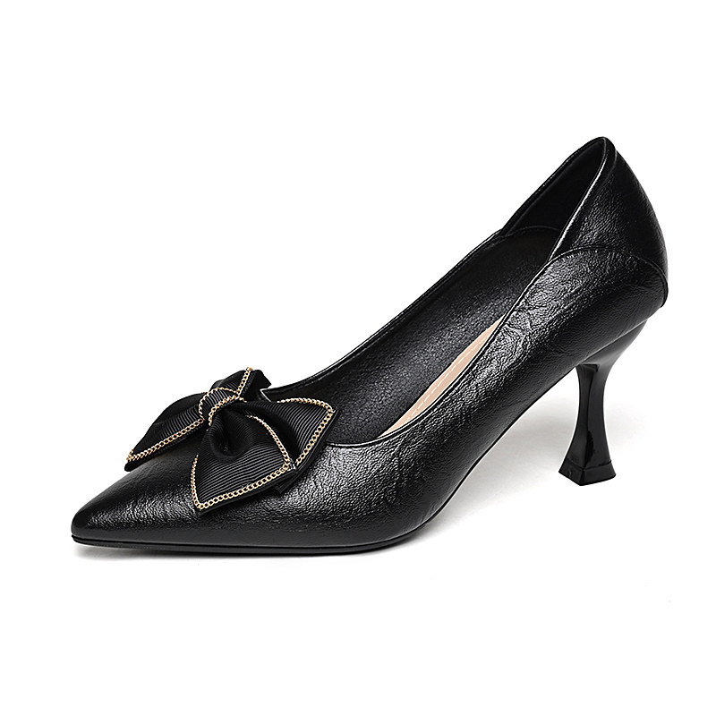 真皮蝴蝶结单鞋女尖头细跟高跟鞋
