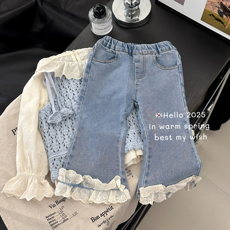 女童春款娃娃领衬衫2025新款时髦针织镂空背心甜美休闲牛仔裤套装