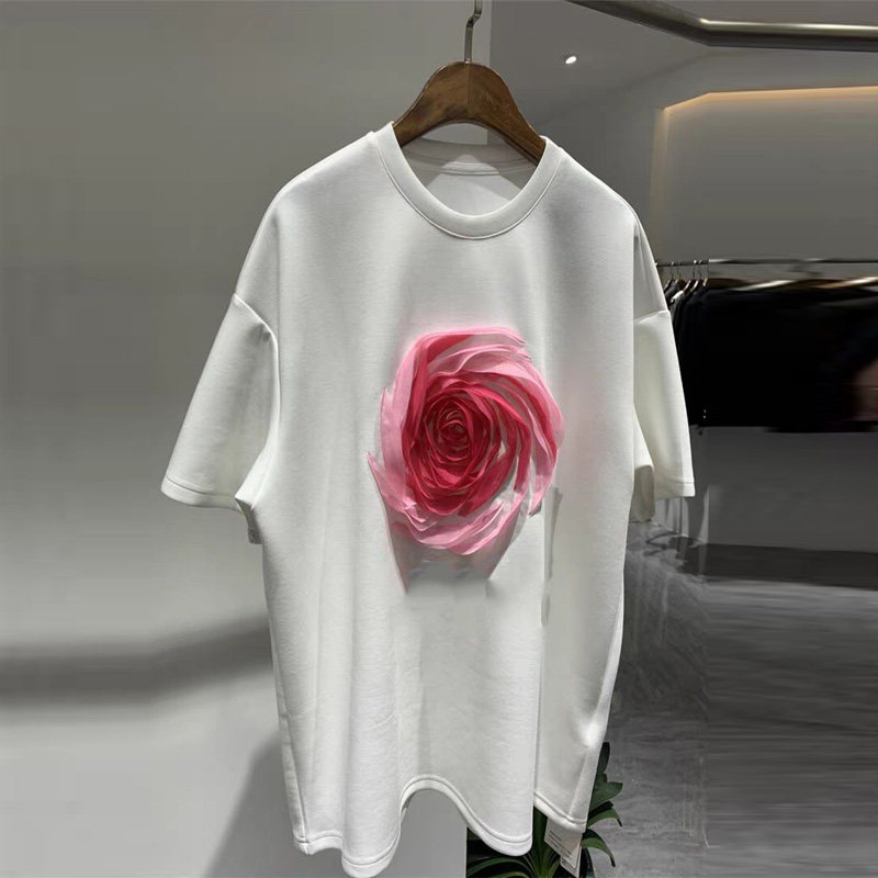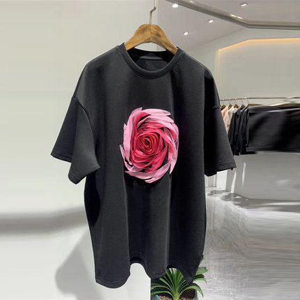 2025春夏新款欧洲站新款玫瑰花圆领短袖T恤宽松版潮流