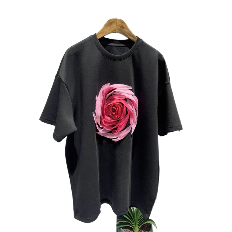 玫瑰花圆领短袖T恤宽松版潮流
