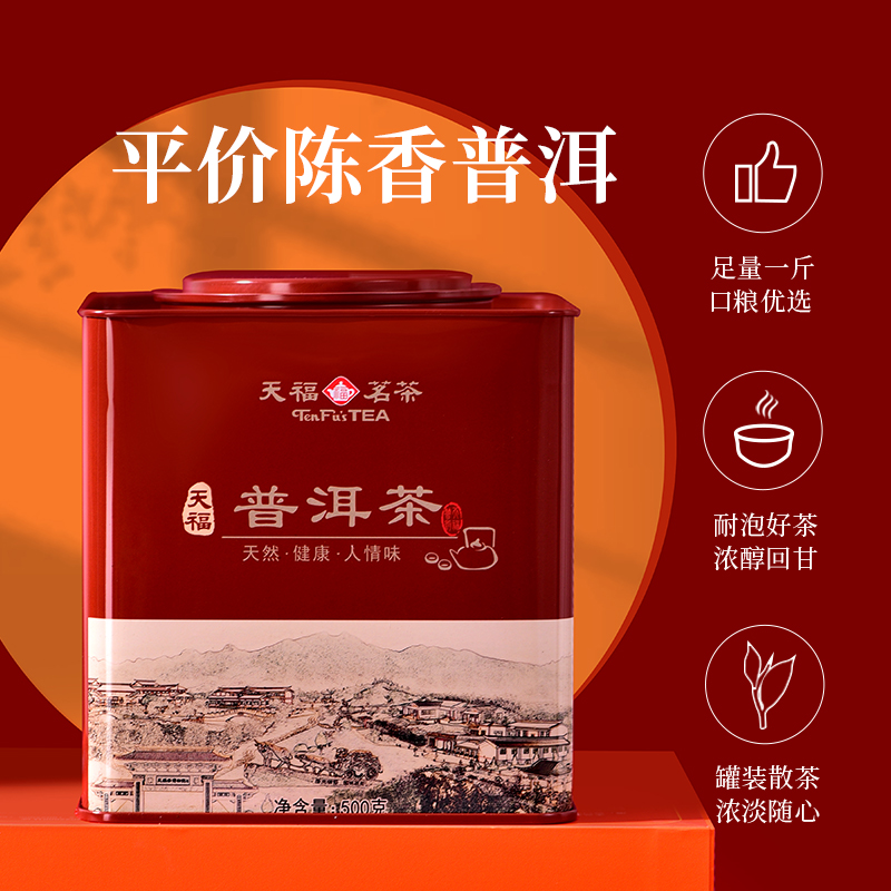 天福茗茶大铁罐天福普洱茶 云南普洱熟茶散茶 方形罐装500克