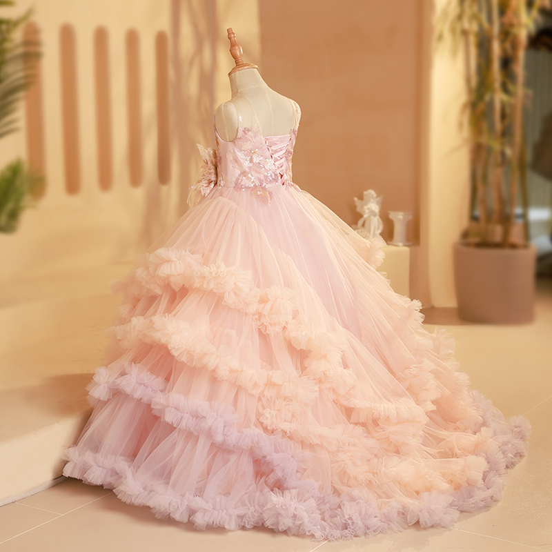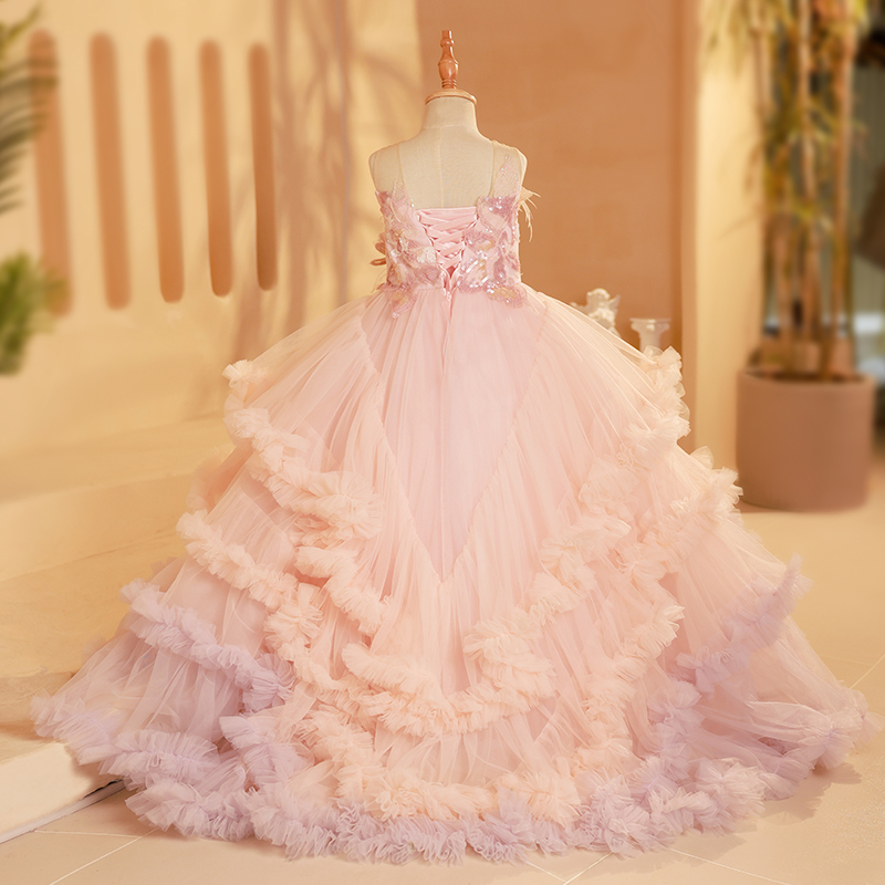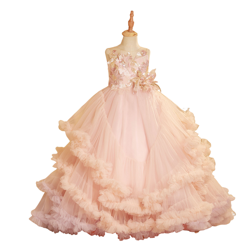 女童礼服粉色轻奢高端拖尾生日公主裙儿童主持人走秀钢琴演出长裙