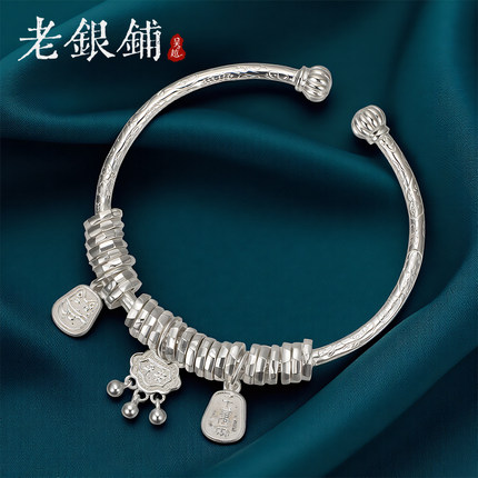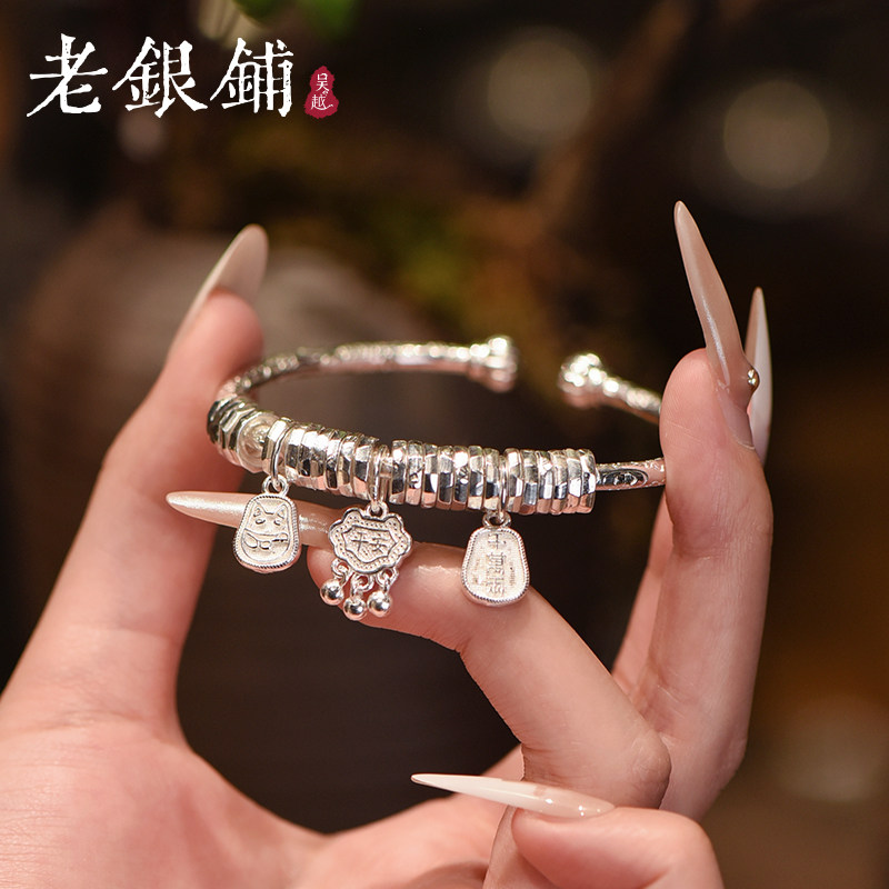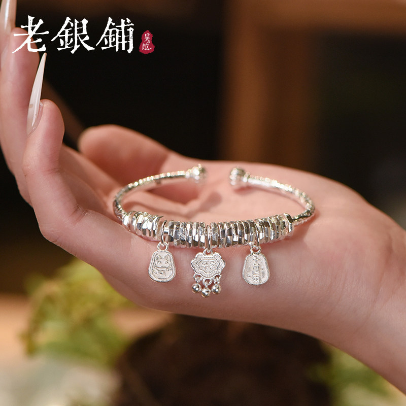 吴越老银铺9999纯银手镯女长命锁挂坠开口银镯小众国风设计感镯子