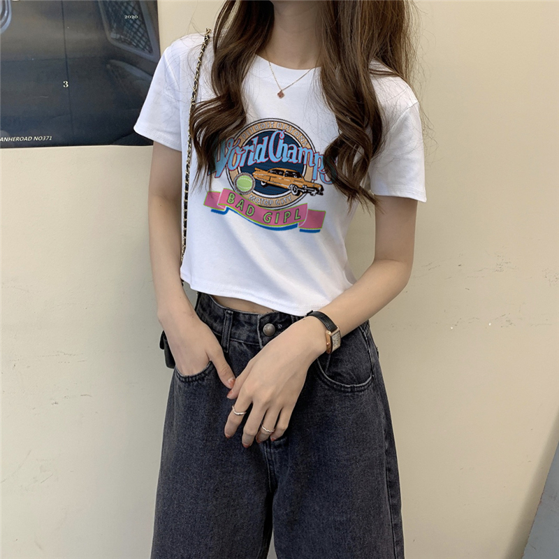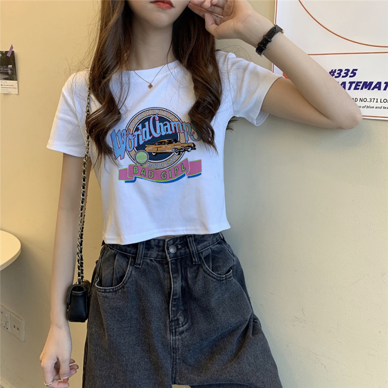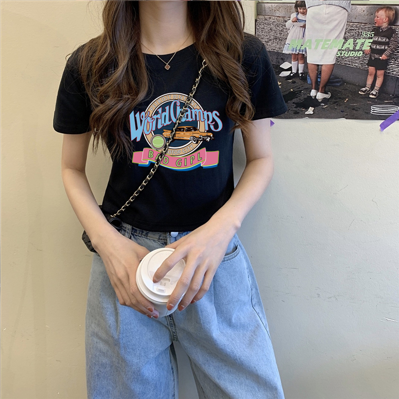 短款上衣设计感小众2025新款高腰纯棉短袖t恤女正肩夏多巴胺穿搭