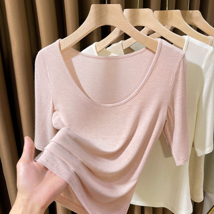 粉色大圆领内搭打底衫女夏季中袖超弹皮肤衣女内搭莫代尔短袖T恤
