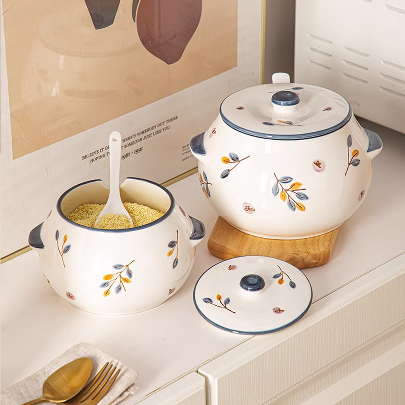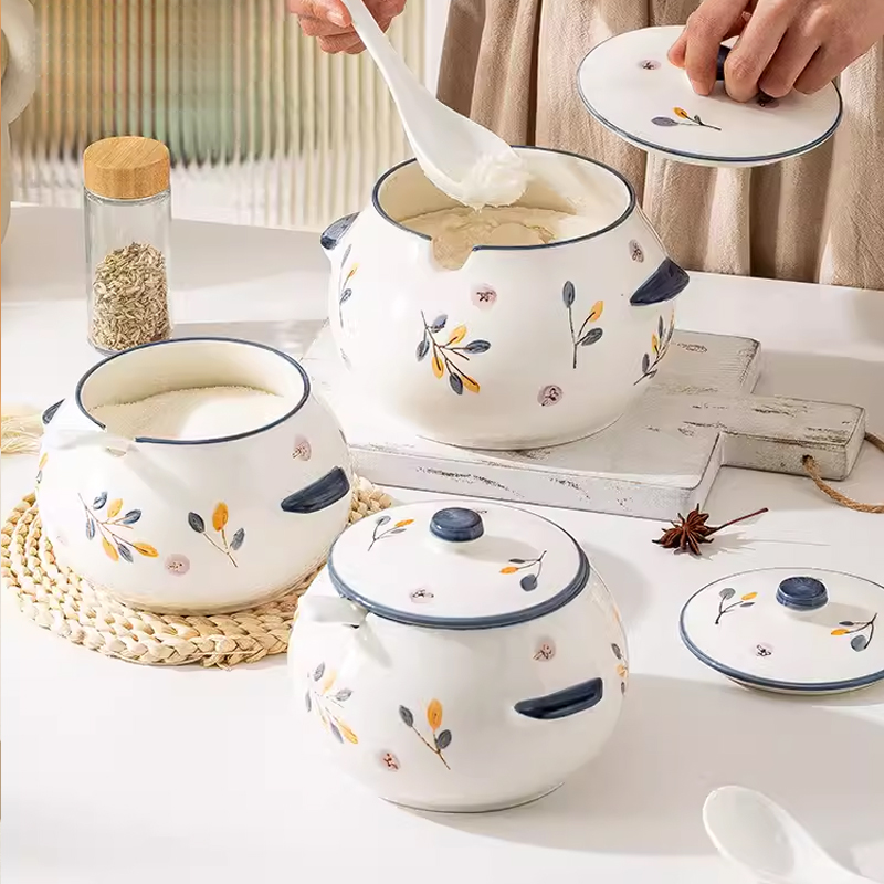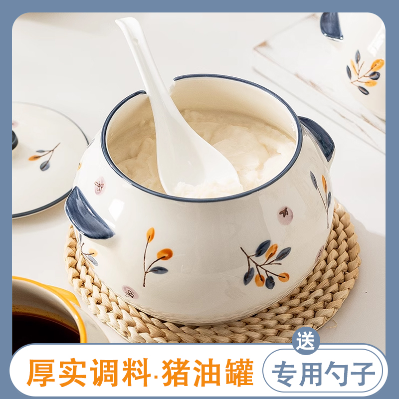 双耳陶瓷猪油罐带盖厨房家用调料罐釉下彩油罐大容量辣椒油盐罐子