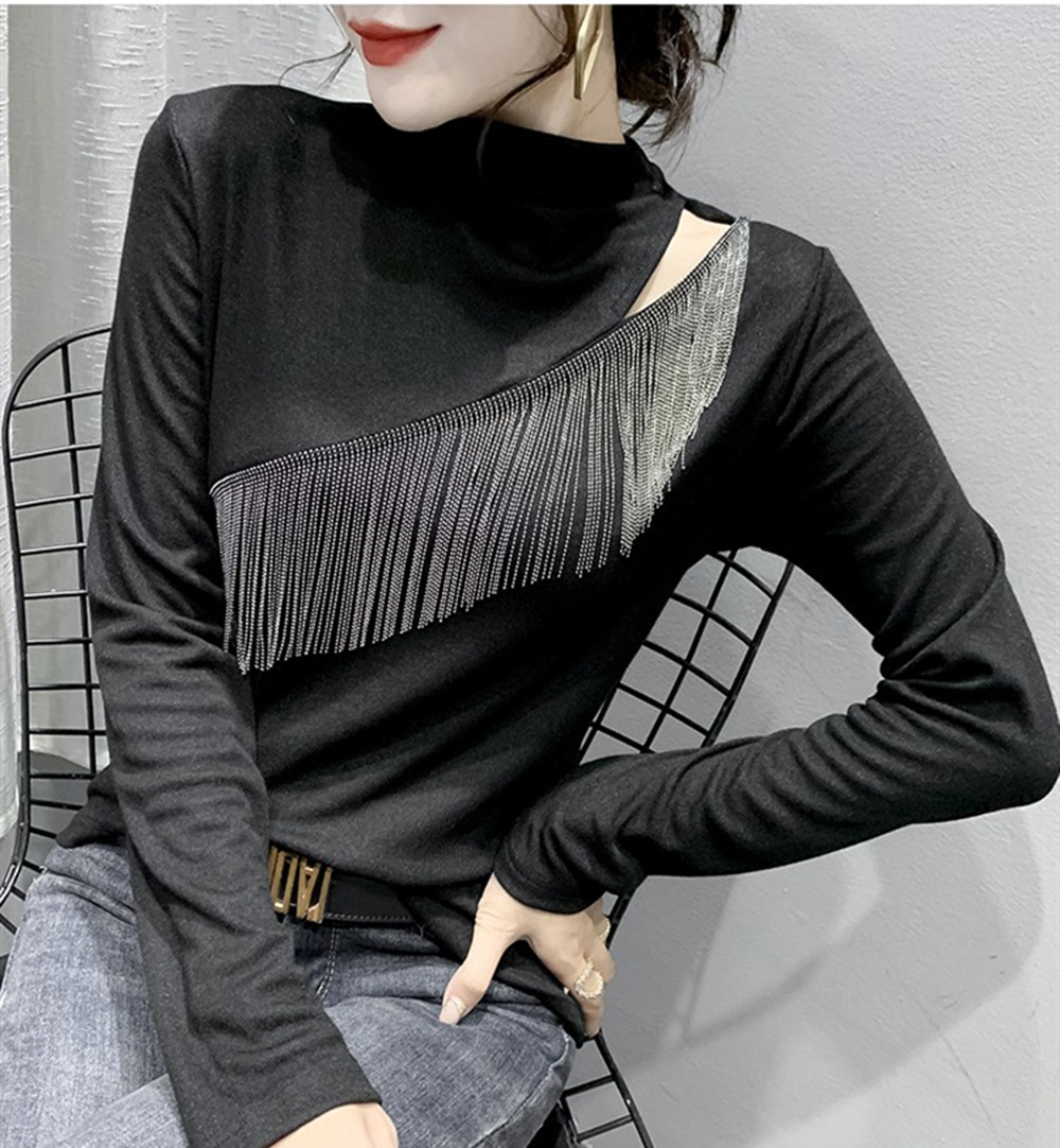 大码胖MM欧洲站秋冬新款流苏链条长袖黑色T恤心机镂空打底衫女潮