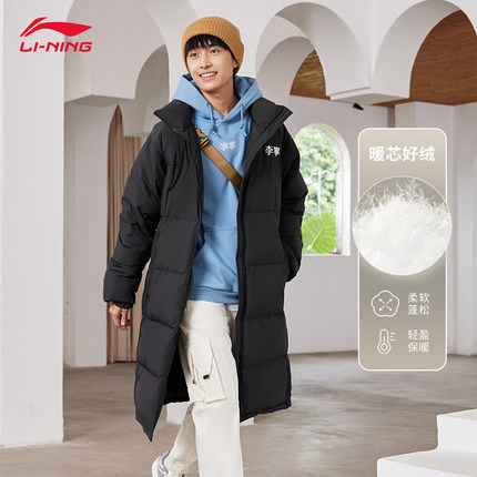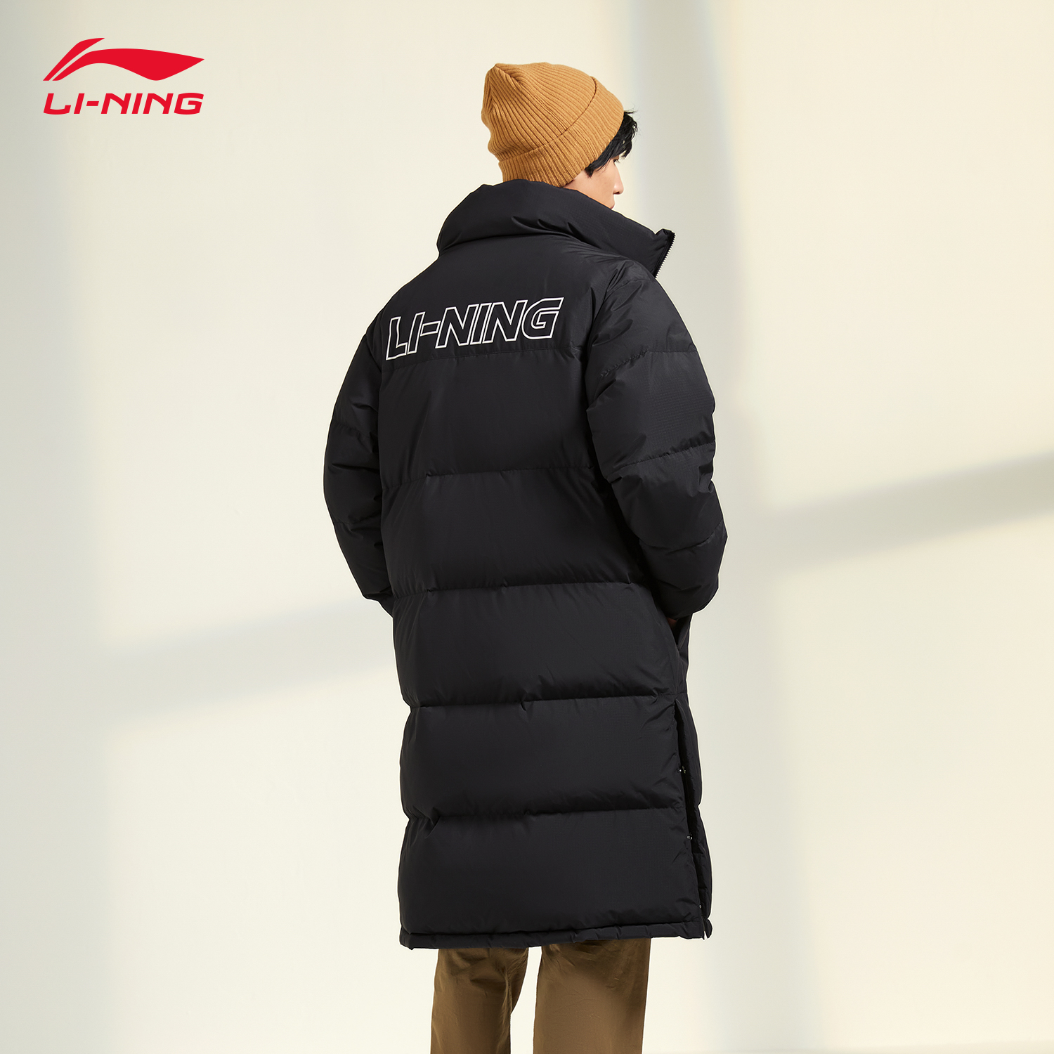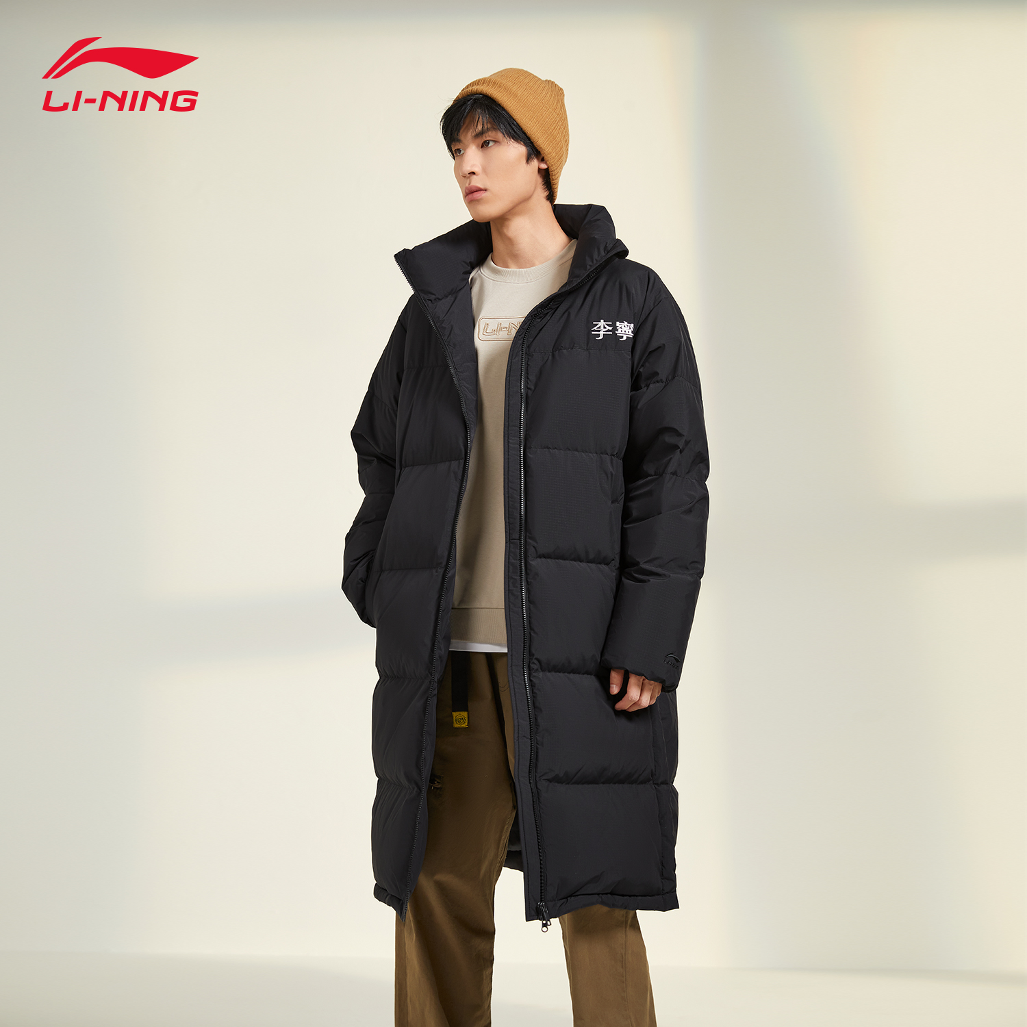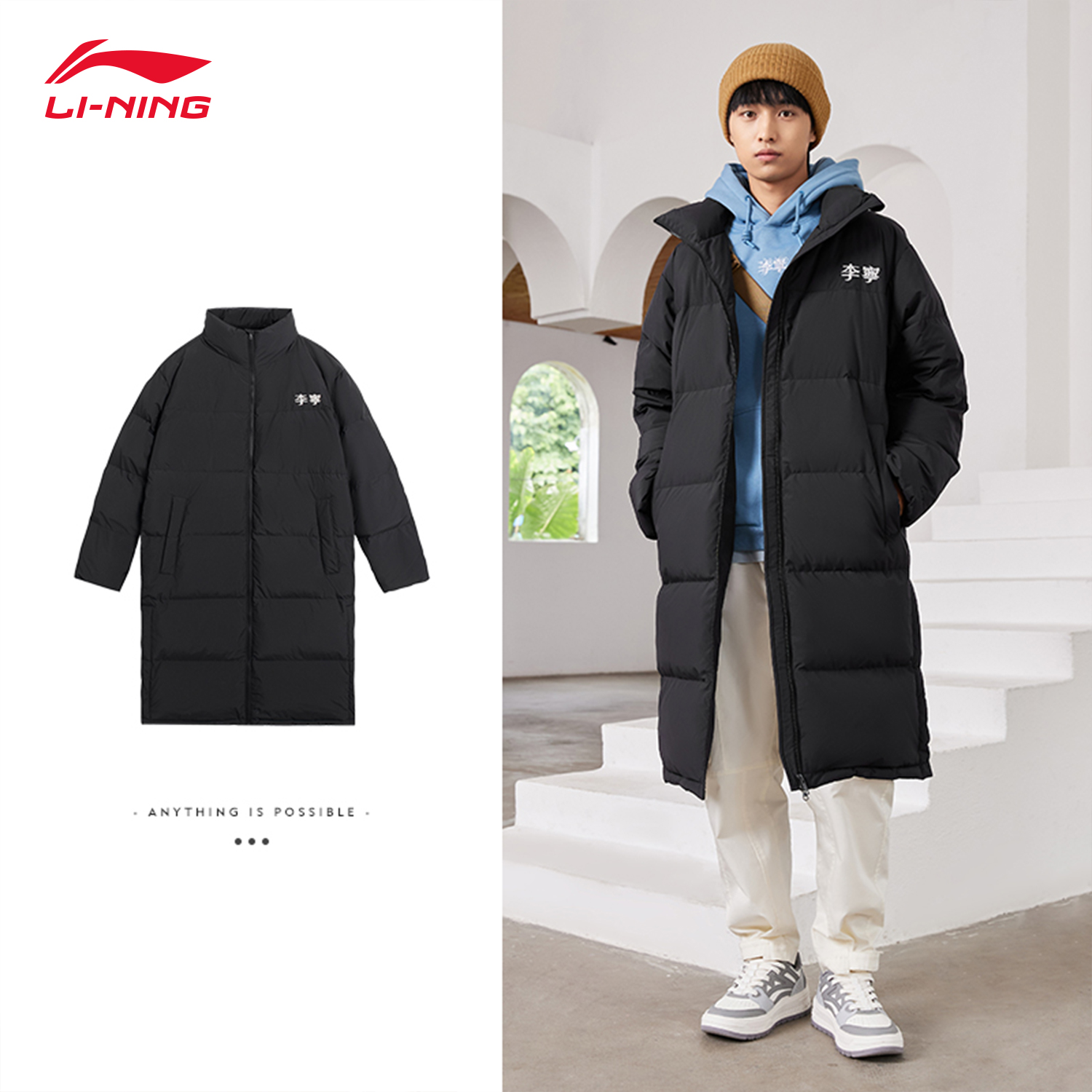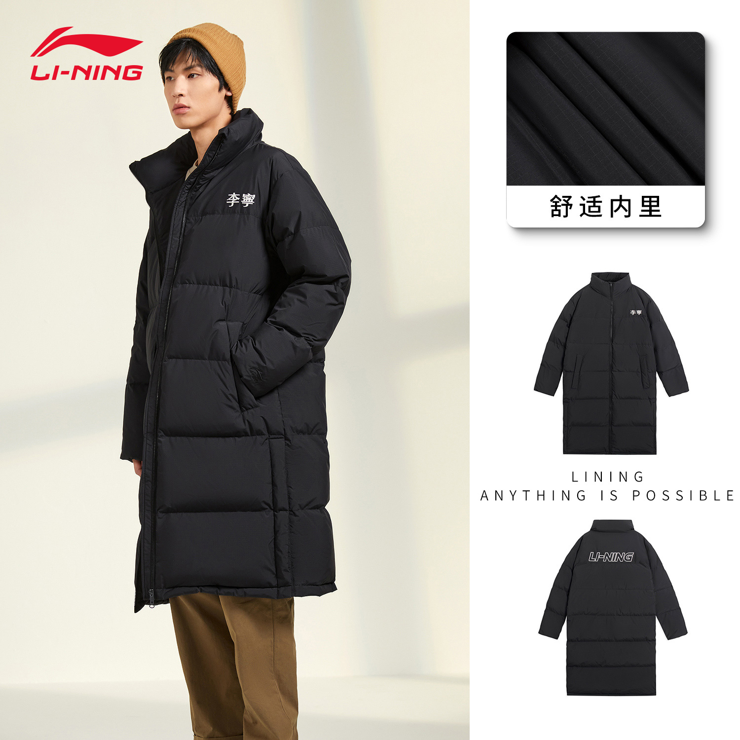 李宁长款羽绒服加绒加厚立领袜套冬季保暖防风黑色羽绒服过膝男款