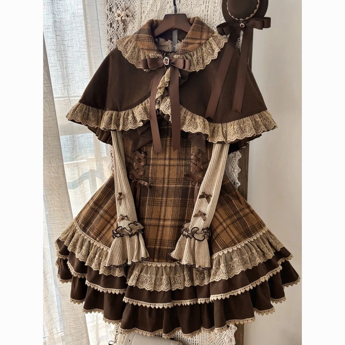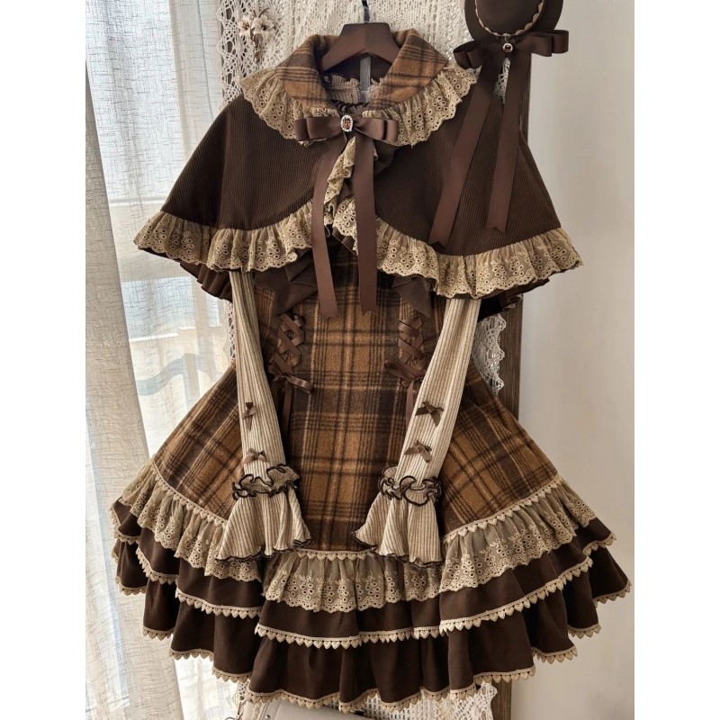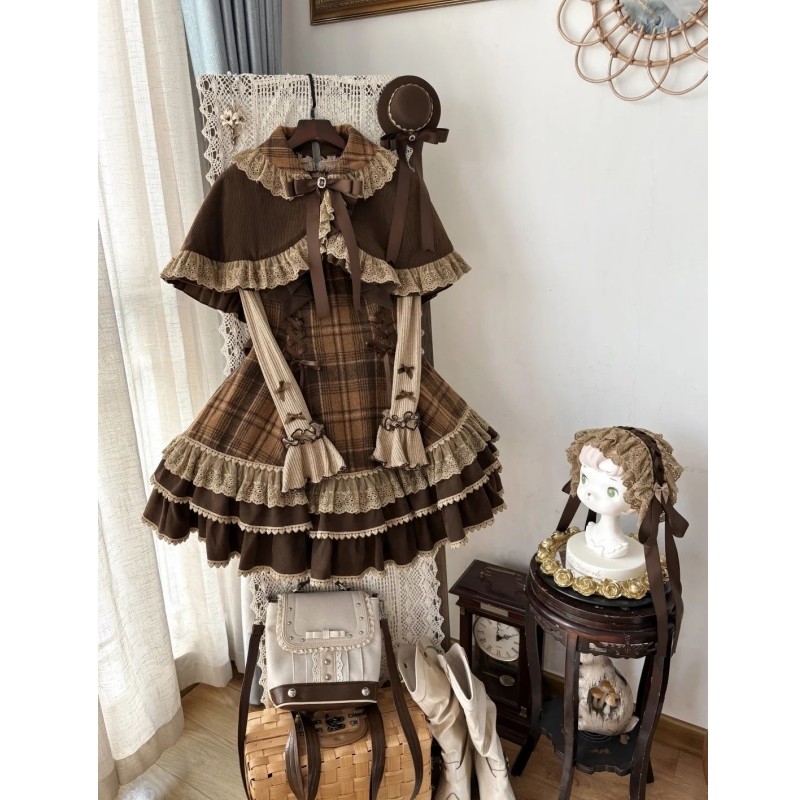 秋冬甜美软妹风Lolita裙洛丽塔打底衣复古格纹背带裙斗篷外套套装