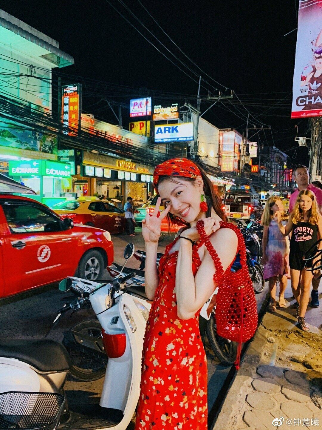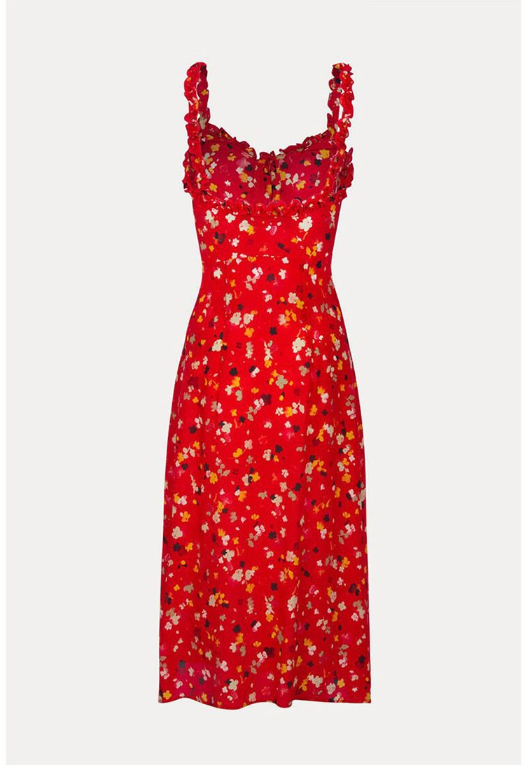 红色碎花木耳花边真丝吊带连衣裙