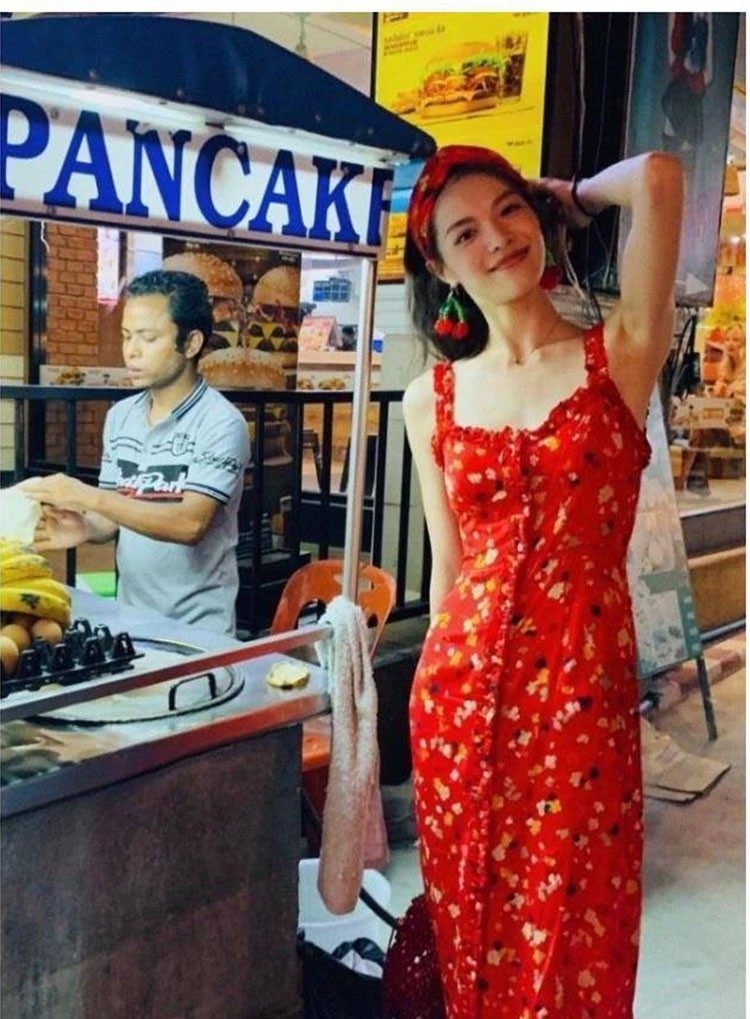 小鱼自制 红色碎花木耳花边真丝吊带连衣裙ISN博主同款复古高腰