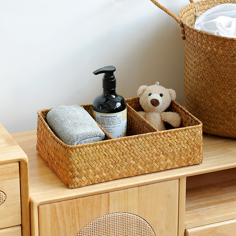 Kens草编桌面分格收纳盒茶几遥控器钥匙收纳筐化妆品分类整理盒