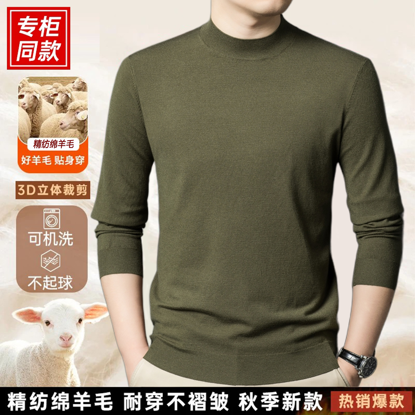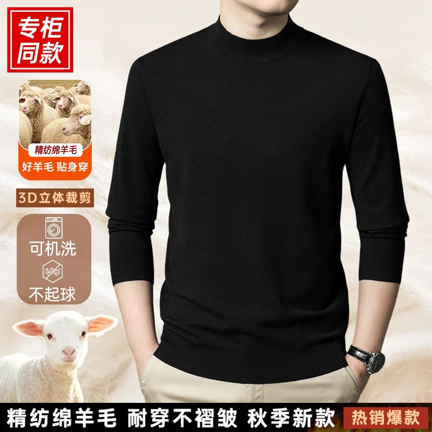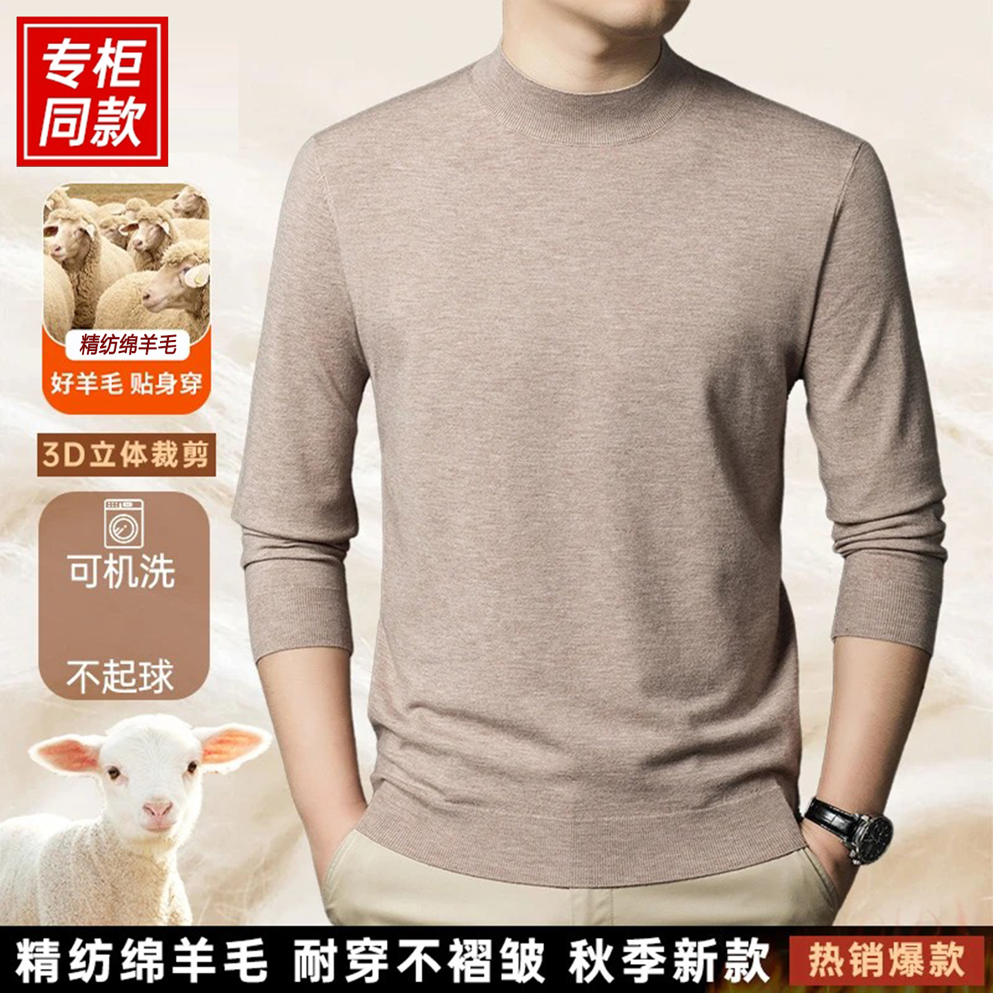 鄂尔多斯市产春秋款男士纯羊毛精纺针织衫可机洗半高领打底毛衣男