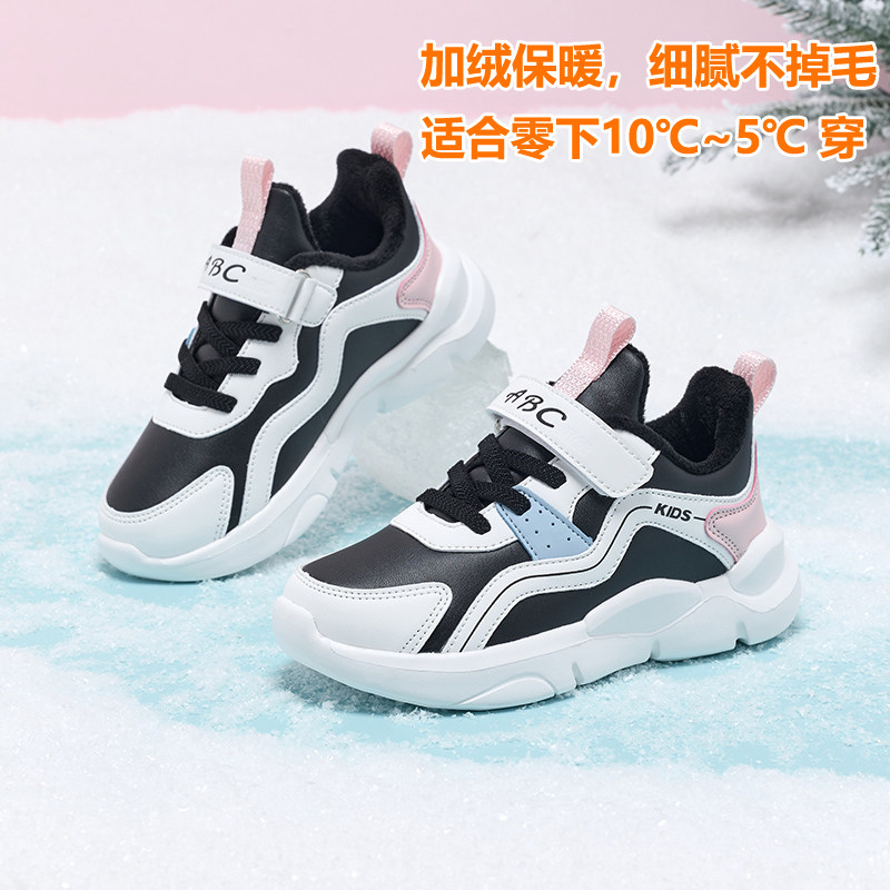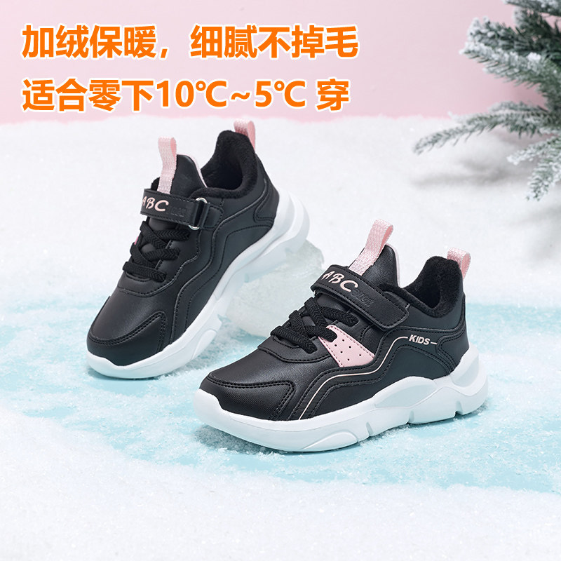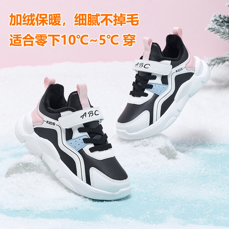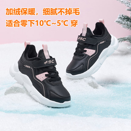 新款ABC女童鞋新款秋冬二棉加绒皮面黑色运动鞋中大童跑步鞋