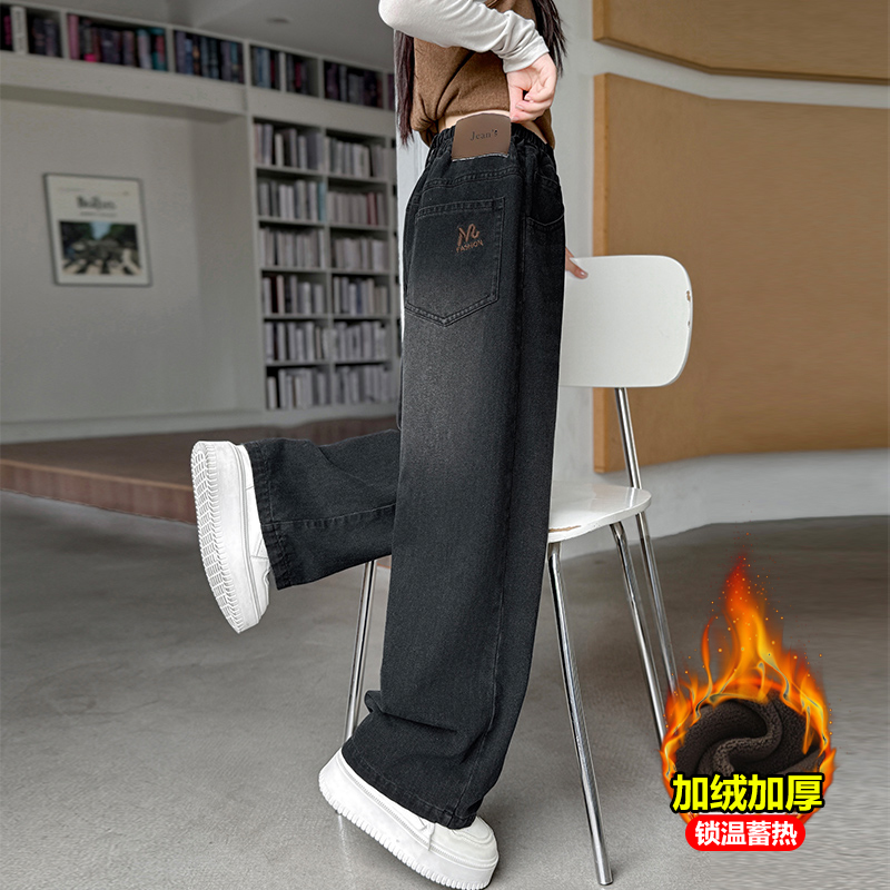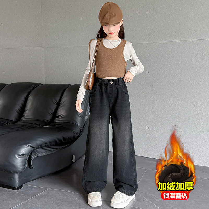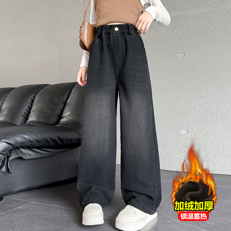 女童裤子牛仔阔腿裤加绒秋冬装新款中大童韩版休闲直筒裤冬季保暖