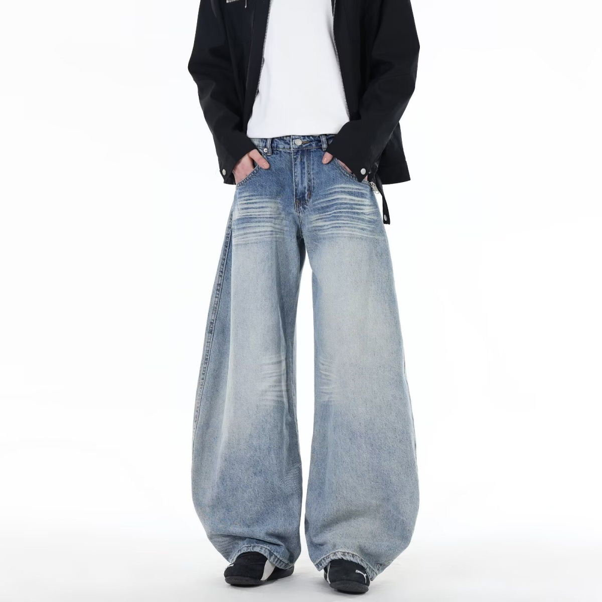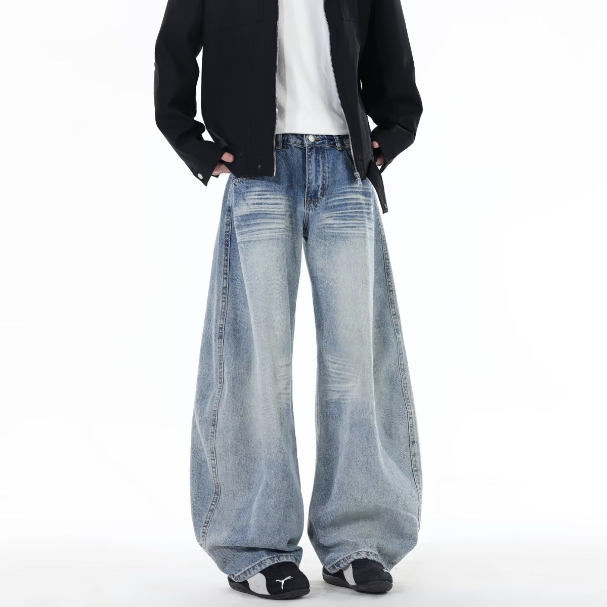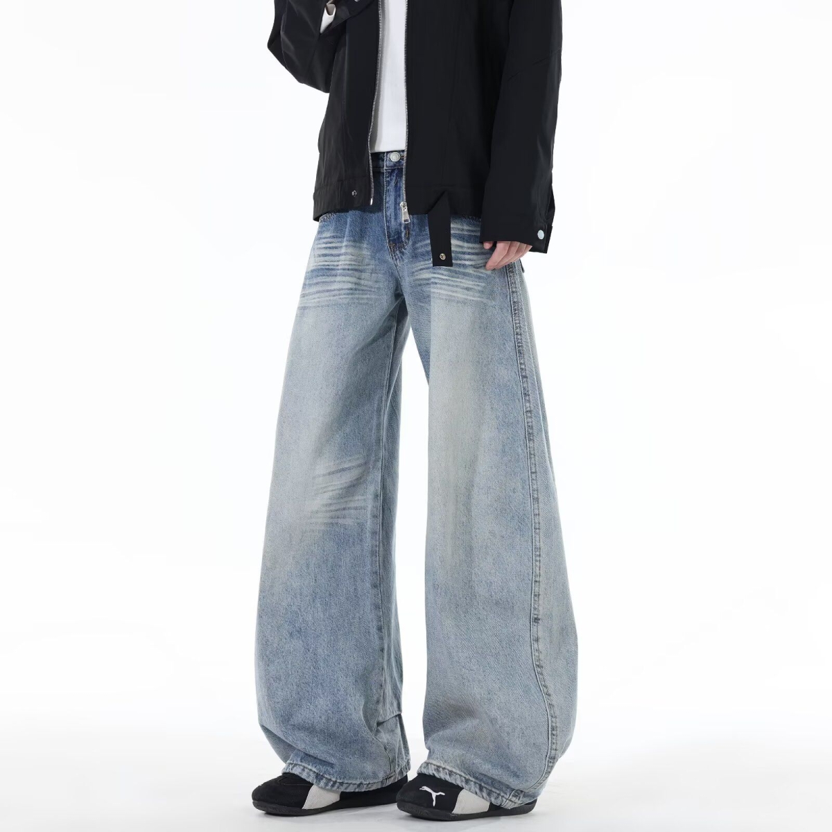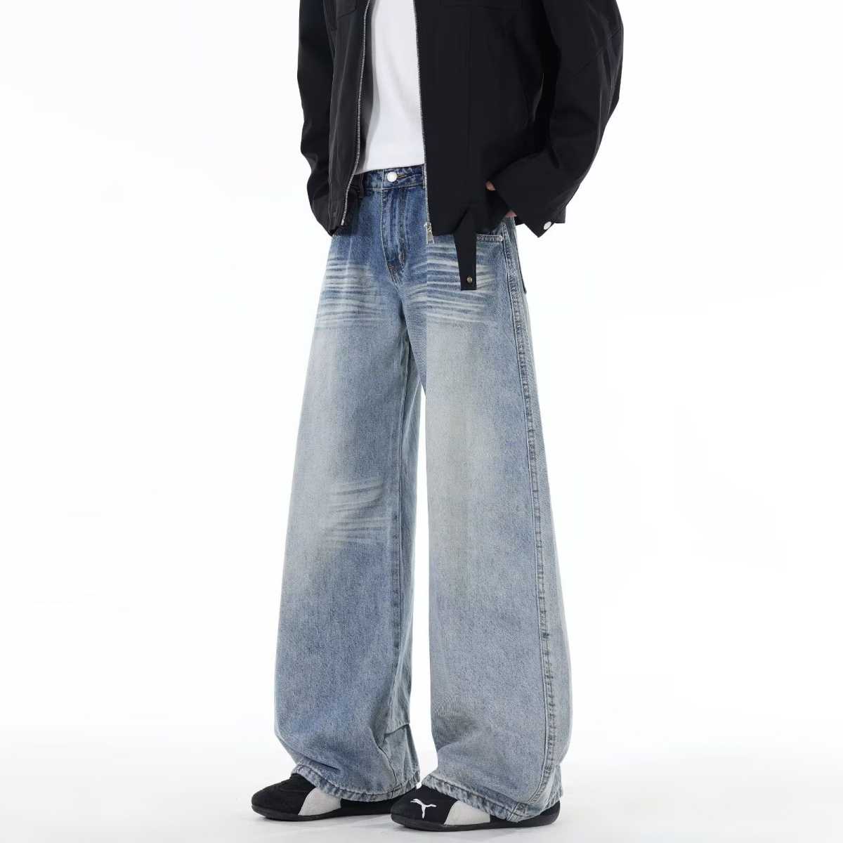 美式复古水洗蓝色牛仔裤男夏季薄款潮牌宽松直筒阔腿休闲百搭裤子
