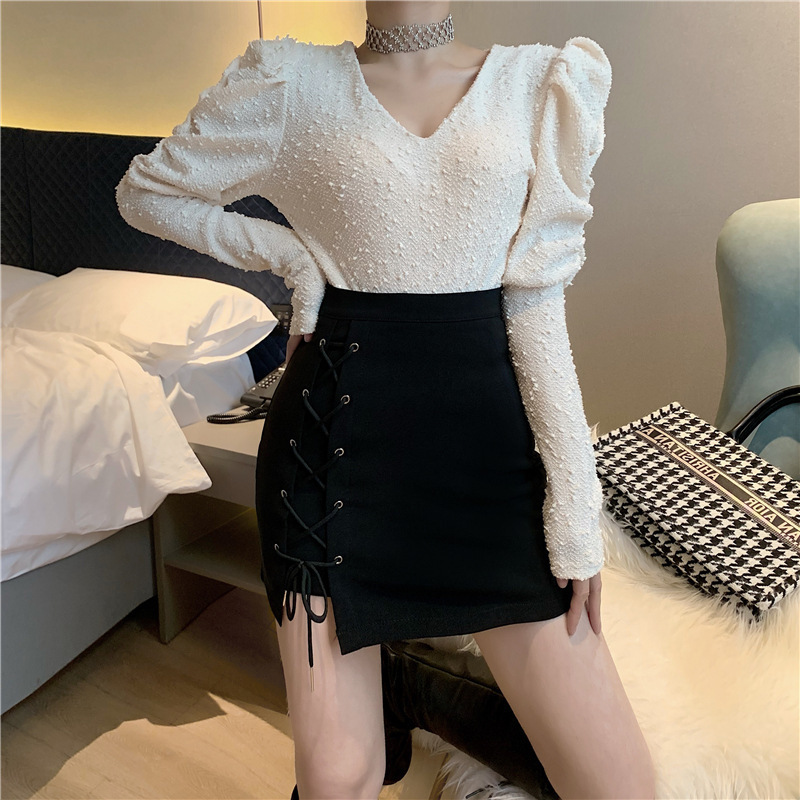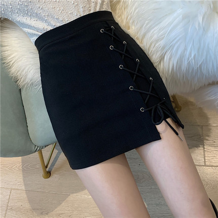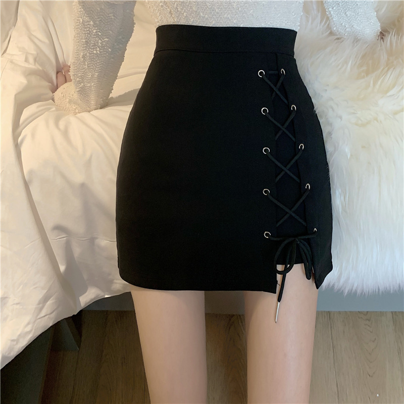 2024春夏新款黑色交叉绑带不规则半身裙女高腰显瘦a字包臀短裙子