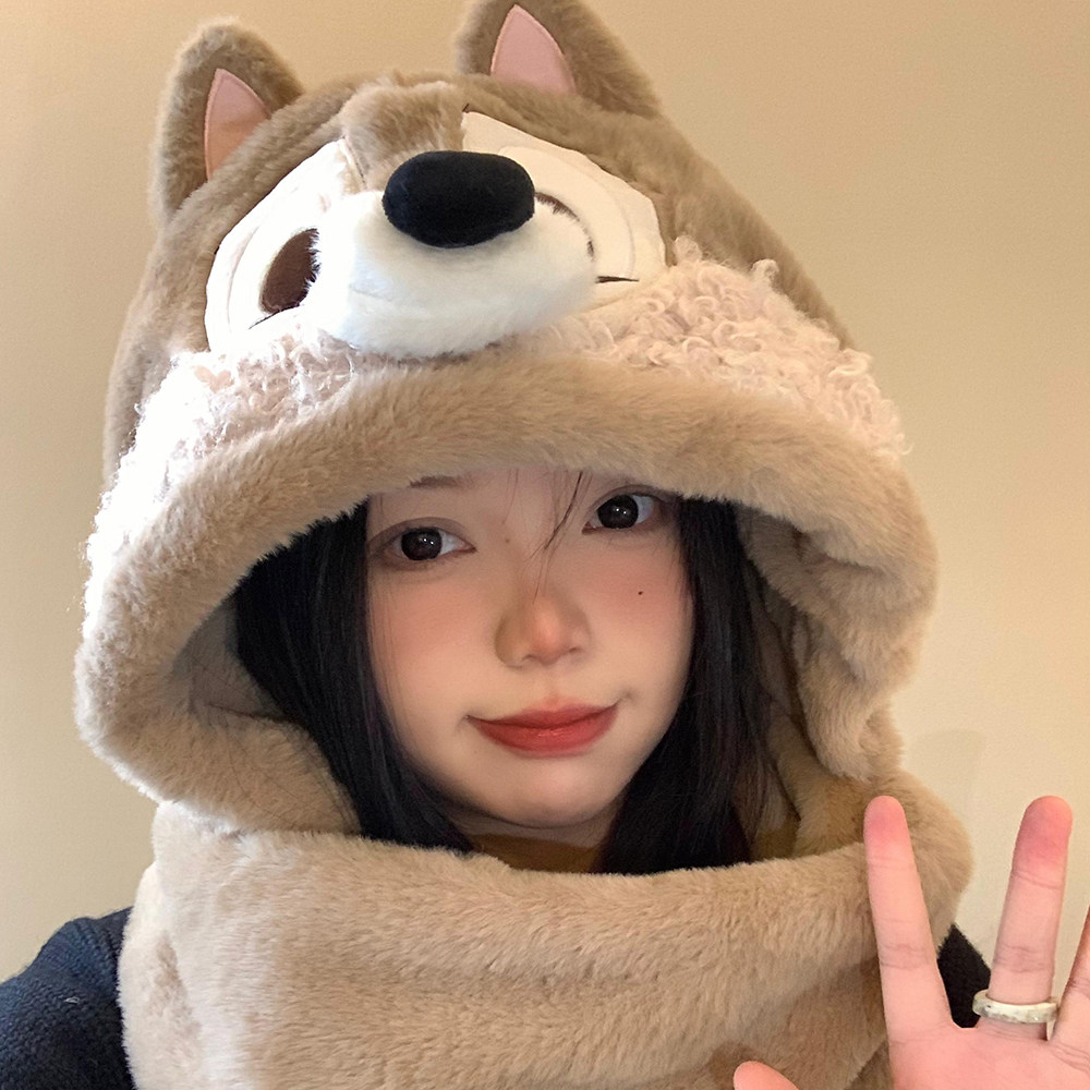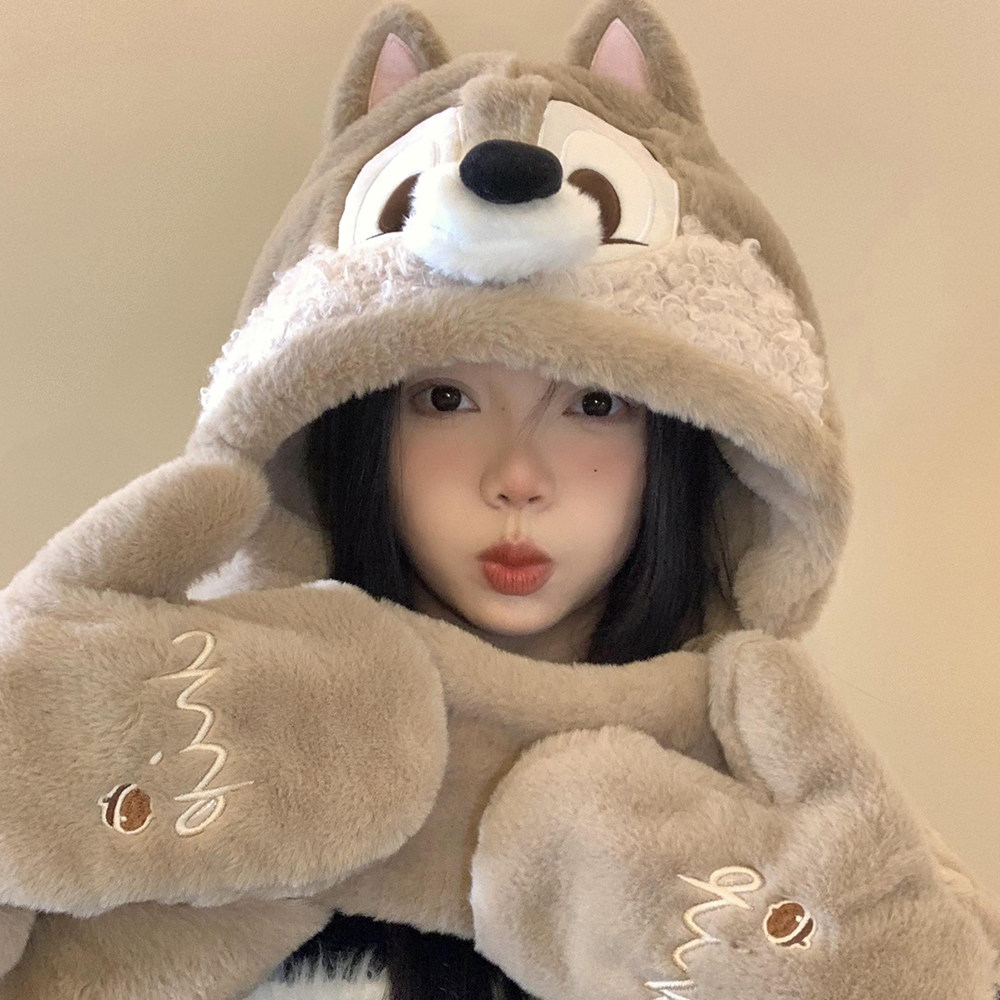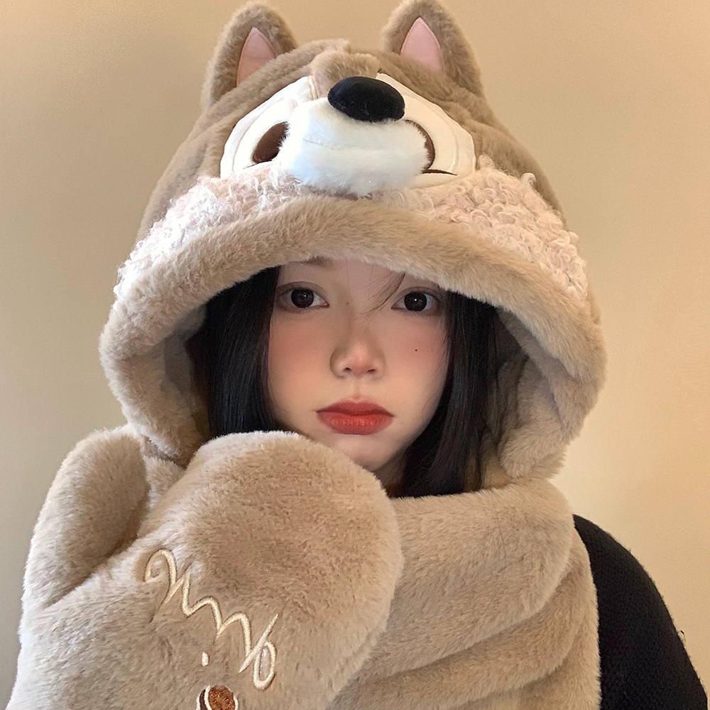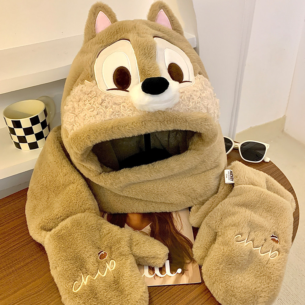 正版迪士尼奇奇蒂蒂帽子围巾一体女冬季毛绒可爱保暖手套三件套潮