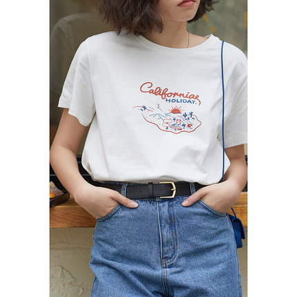 MISAZ California!红蓝配色复古印花 纯白短袖T恤 宽松上衣女