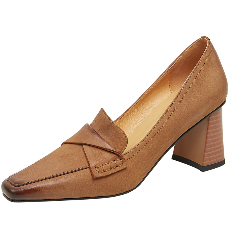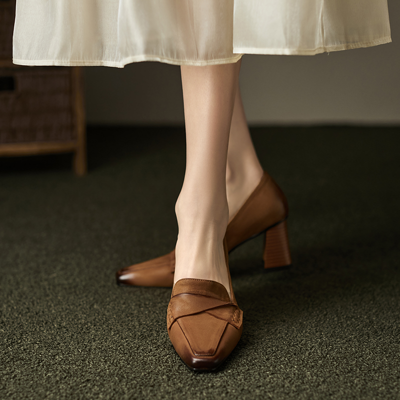 皮厚先生 2024春季新款真皮高跟女鞋 复古小方头粗跟单鞋中口女鞋
