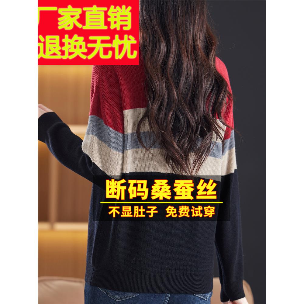 春秋桑蚕丝长袖t恤女宽松大码胖mm妈妈洋气针织条纹上衣打底小衫
