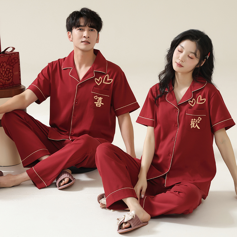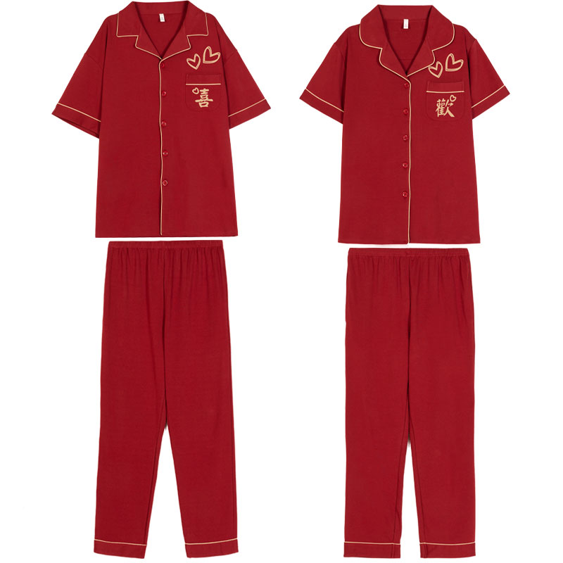 情侣睡衣夏季纯棉短袖长裤男女新婚结婚套装本命年红色大码家居服
