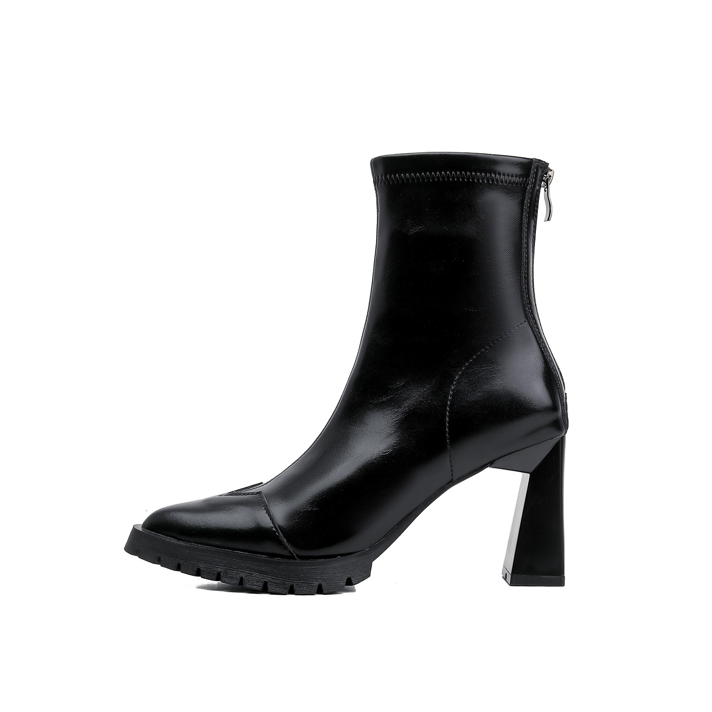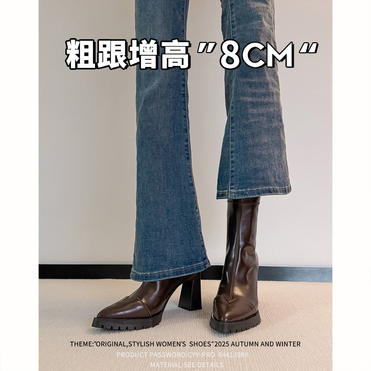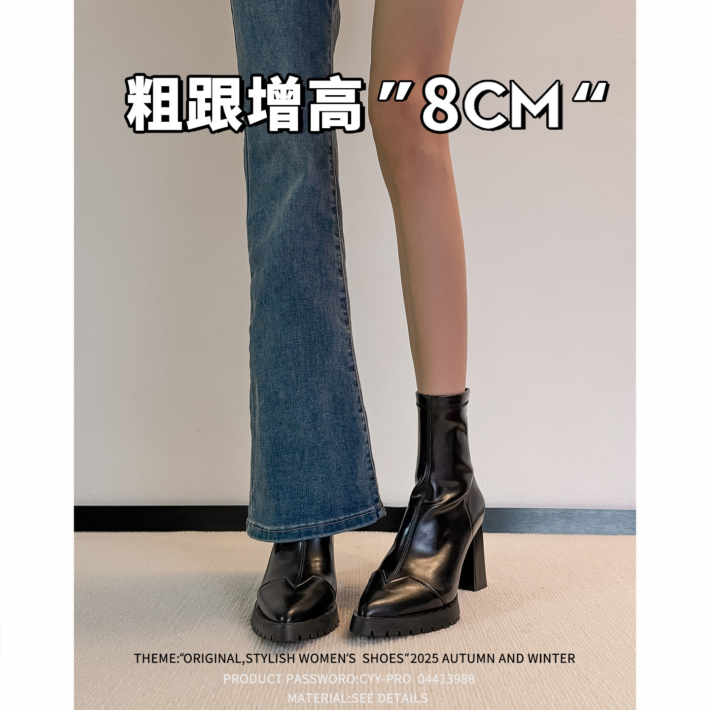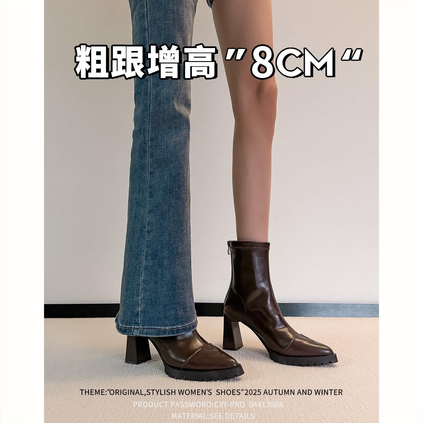 牛皮小个子粗跟增高尖头短靴女2026新款法式高跟鞋女靴弹力瘦瘦靴