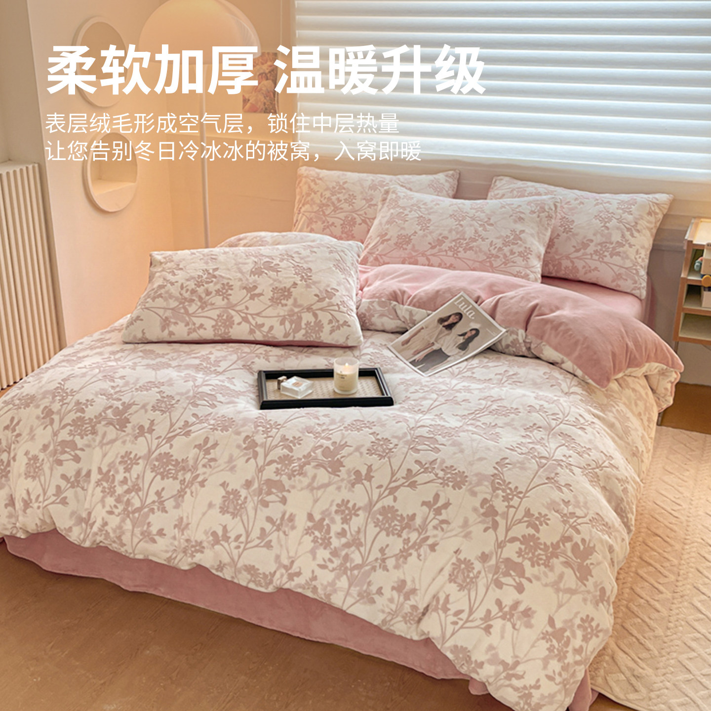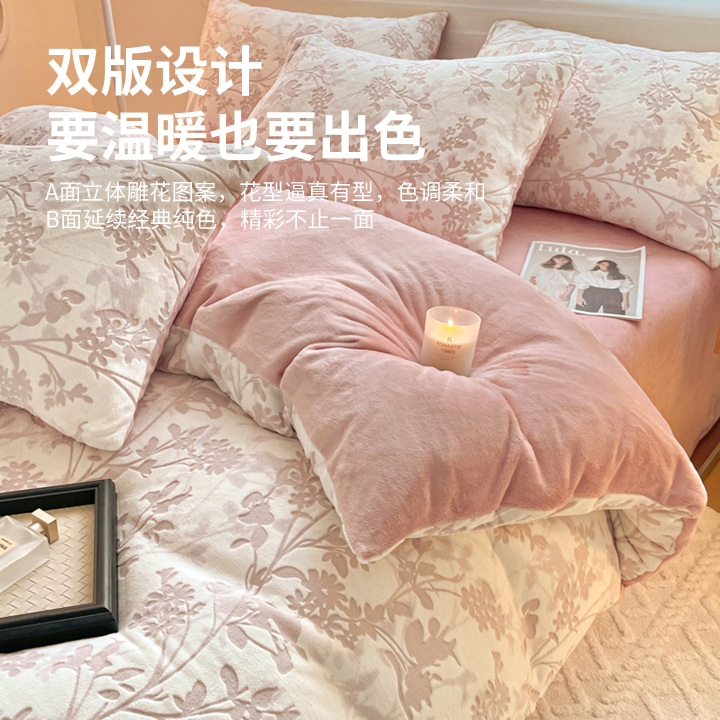 红豆雕花牛奶绒床上四件套冬季双面绒加厚珊瑚绒冬天床笠被套保暖