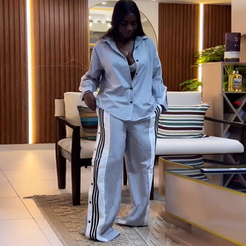 新款欧美女装2025夏季时尚翻领条纹长袖衬衫阔腿长裤休闲套装