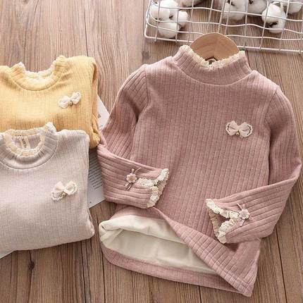 洋气女童加绒加厚打底衫儿童蕾丝花边T恤衫长袖女孩针织冬款上衣