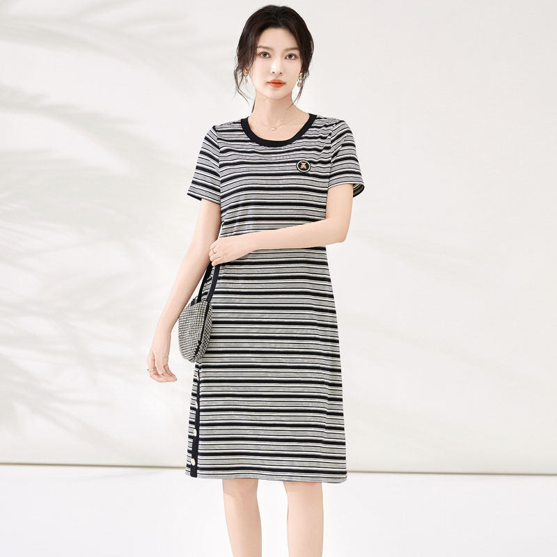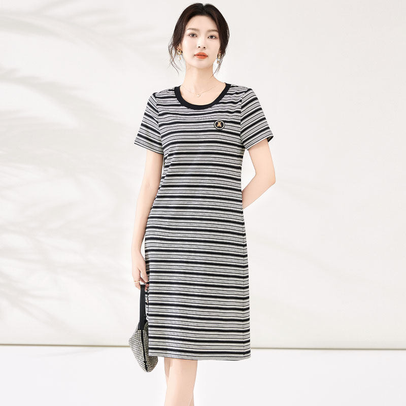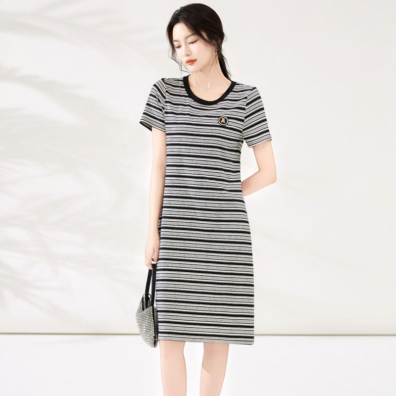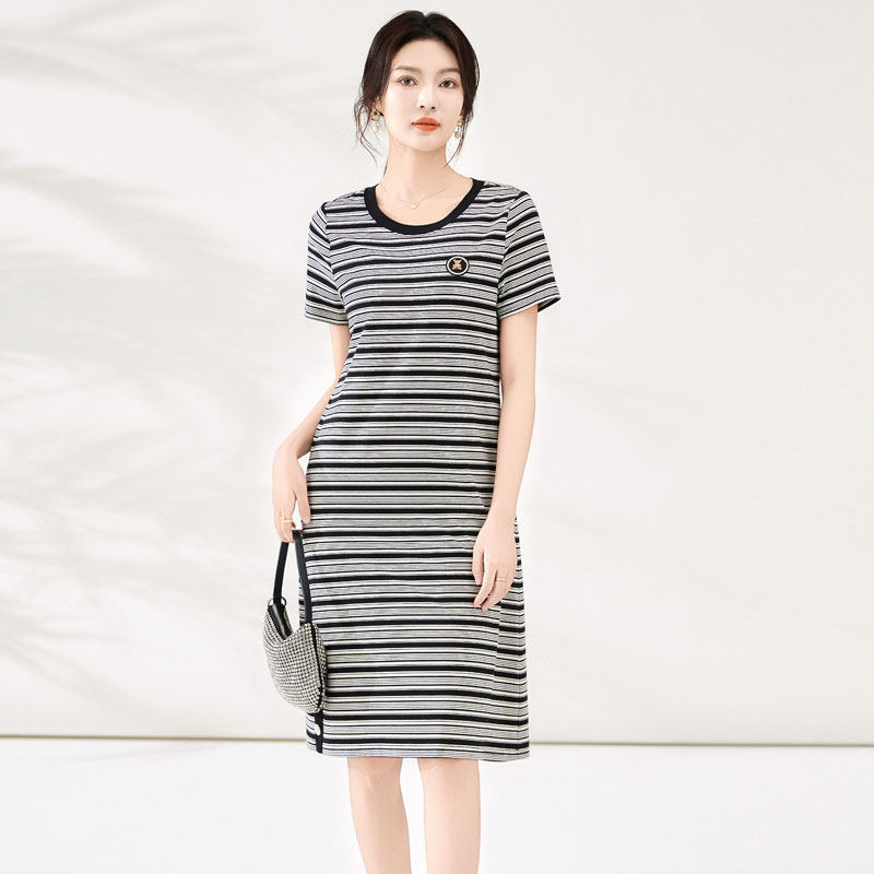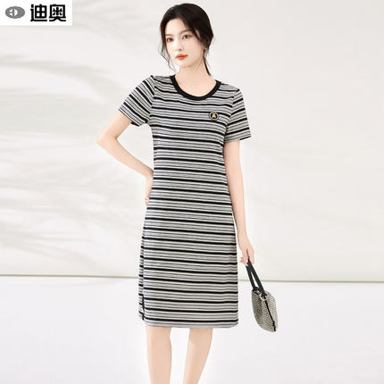 迪奥复古条纹短袖连衣裙女25夏季时尚气质通勤圆领T恤裙休闲裙子