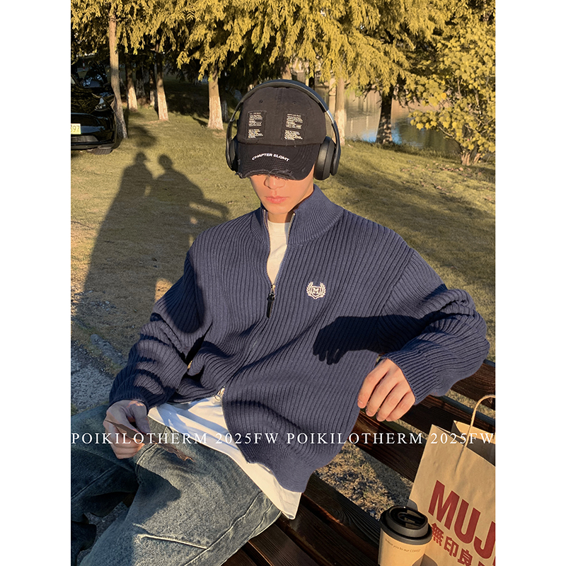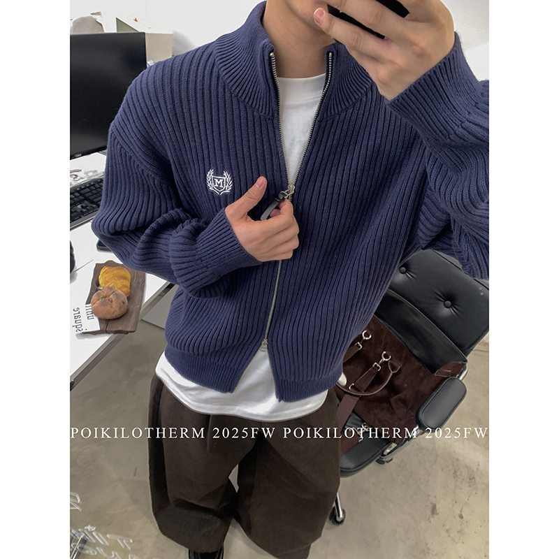 PLTH*韩版秋冬双拉链开衫毛衣男百搭复古提花针织立领上衣外套女