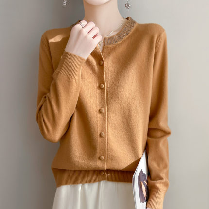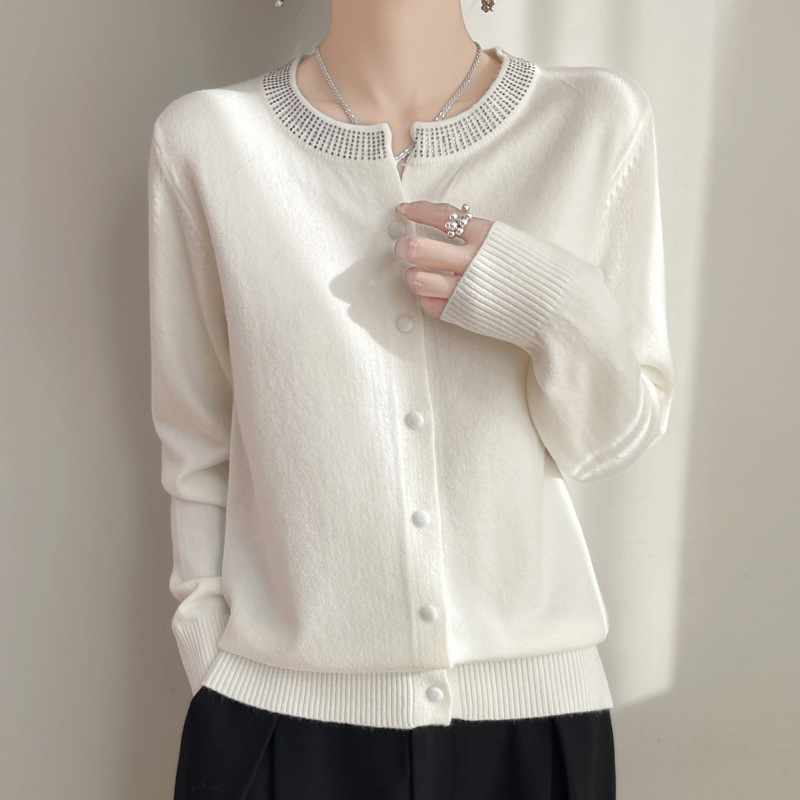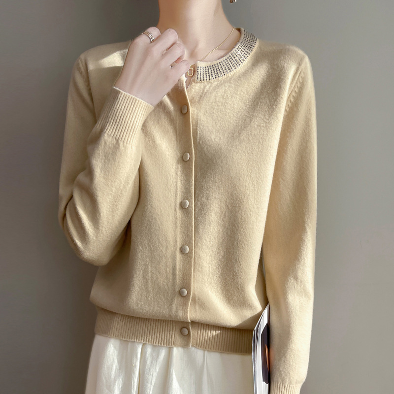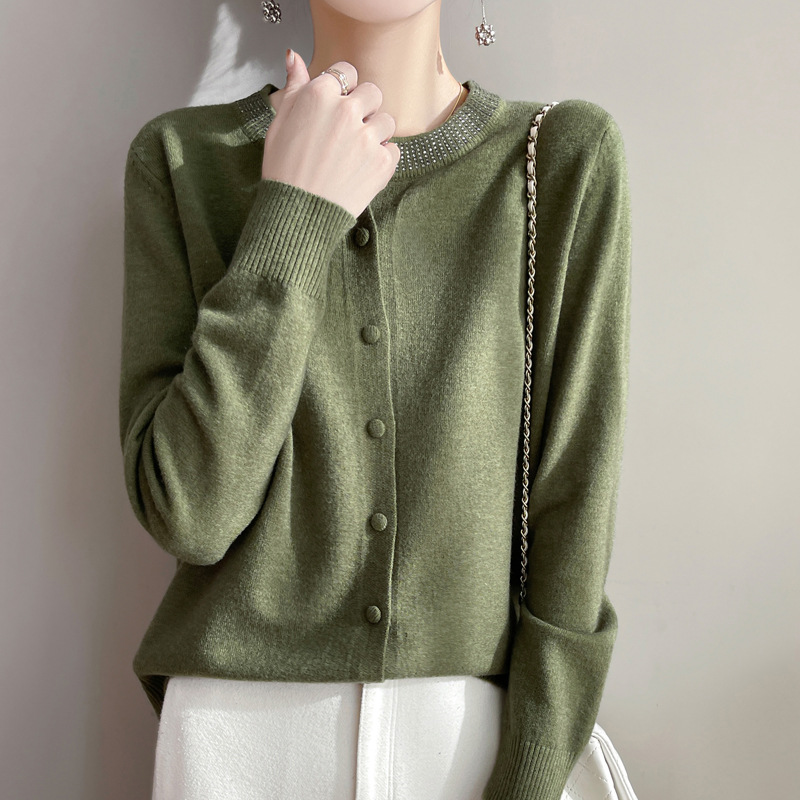羊毛混纺2025春季新短款烫钻宽松圆v领纯色纽扣针织上衣开衫外套