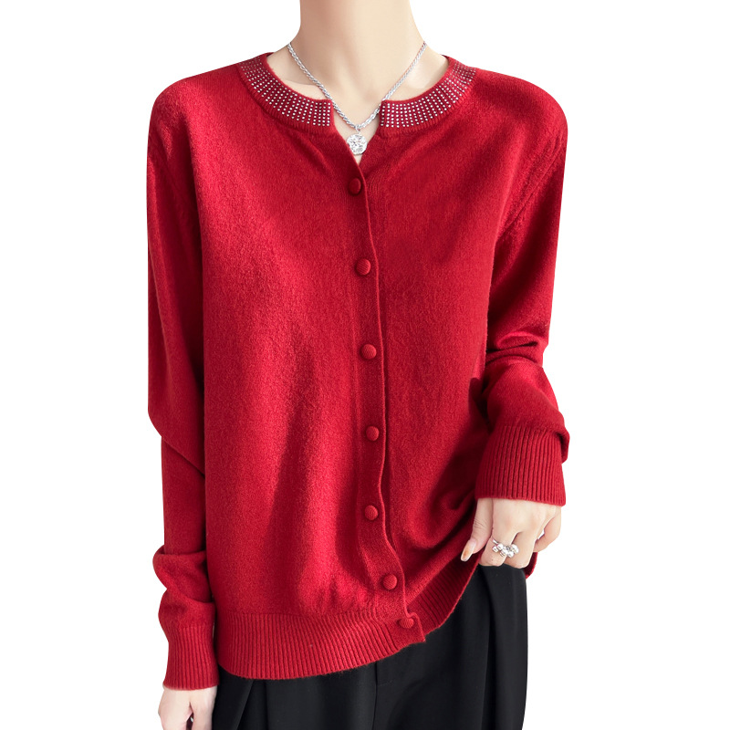 烫钻宽松圆v领纯色针织开衫外套