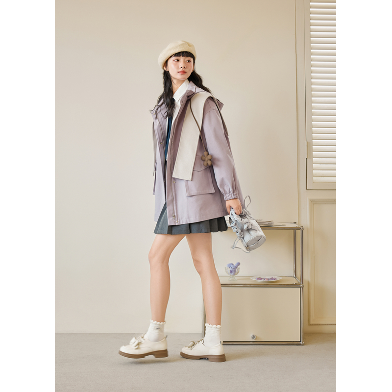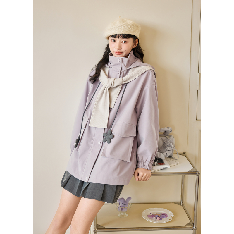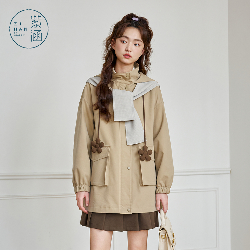 紫涵立领连帽大口袋风衣女春秋季新款甜美设计感宽松显瘦户外外套
