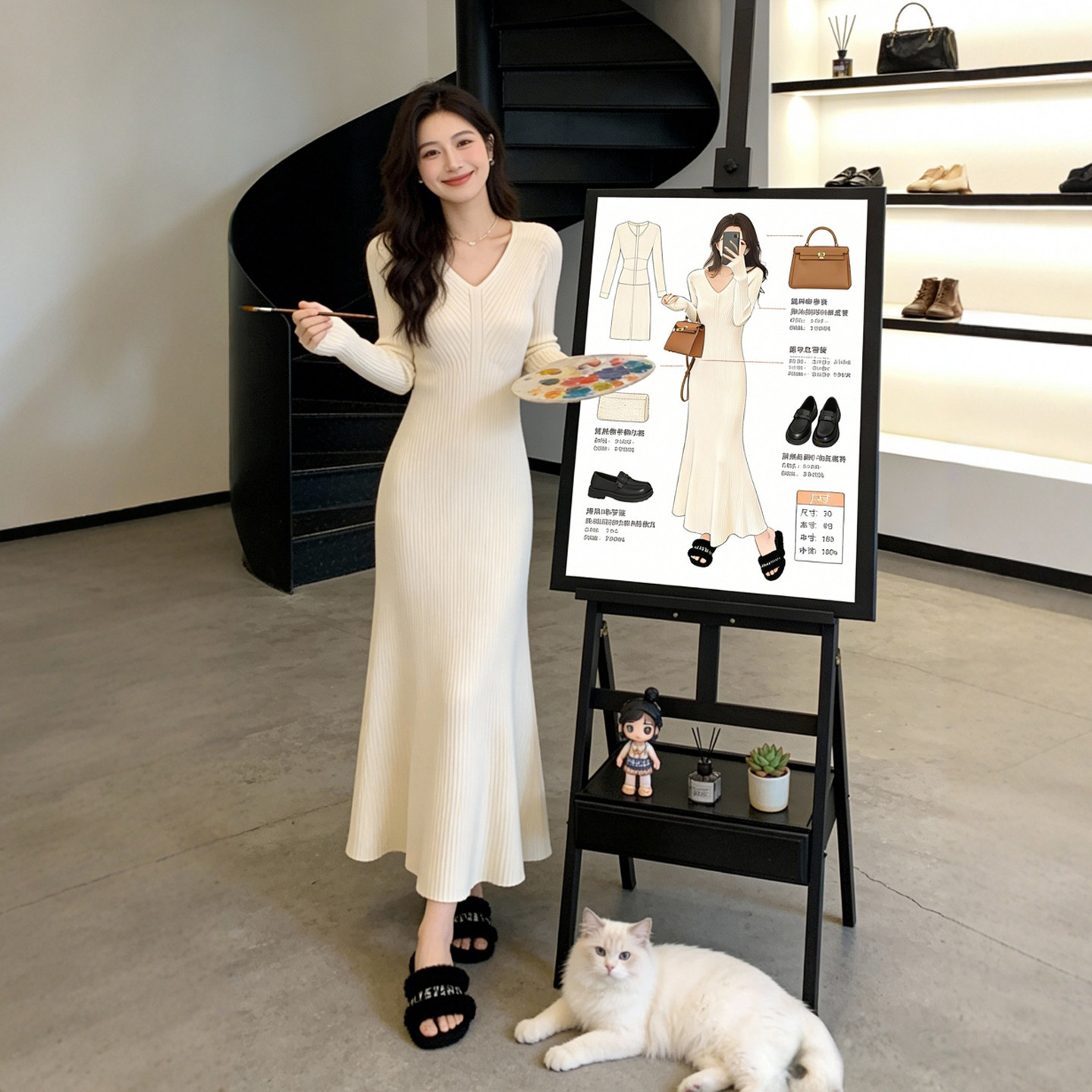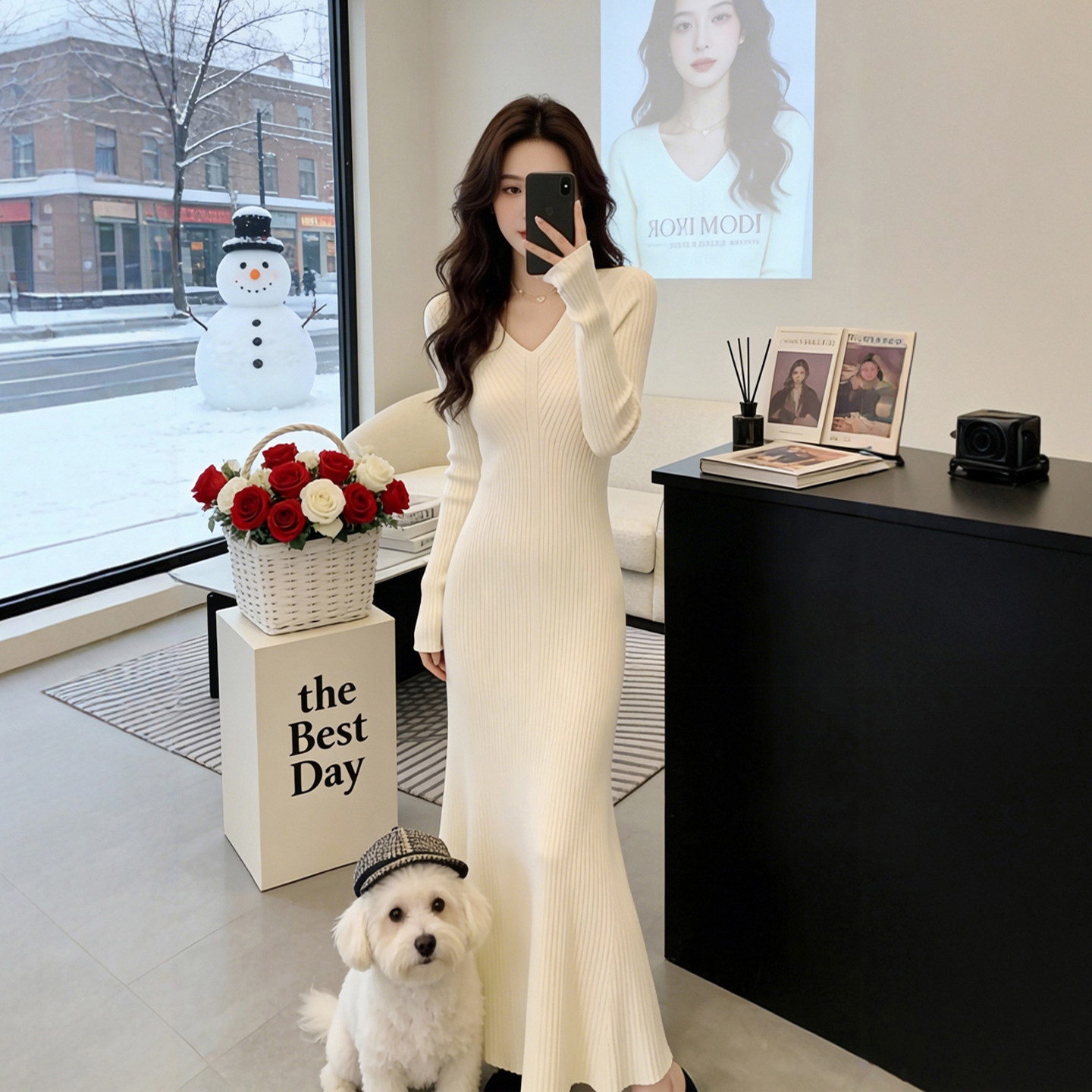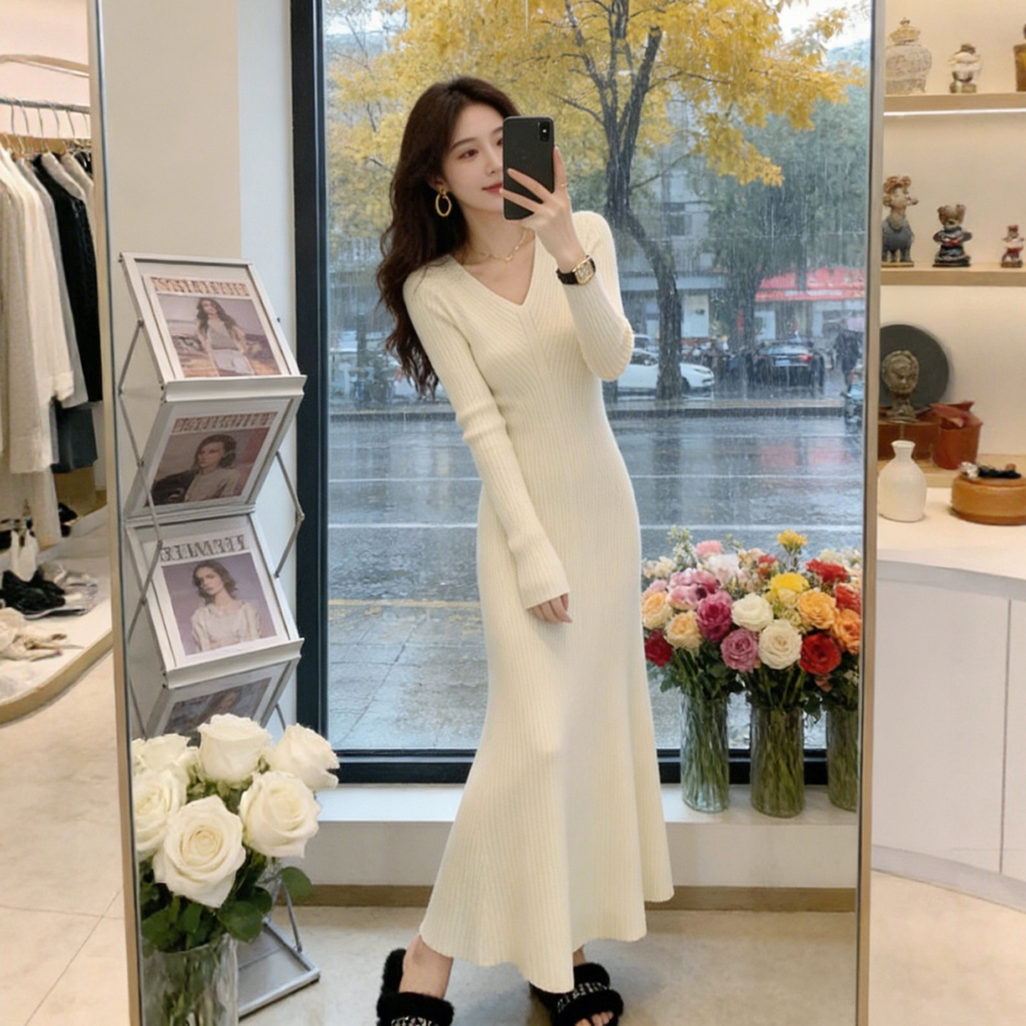 内搭打底v领针织连衣裙鱼尾长裙