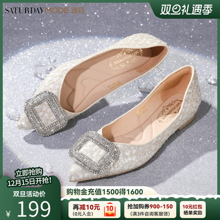 MD女鞋春季新款浅口单鞋法式优雅方扣水钻超软一脚蹬婚鞋平底鞋