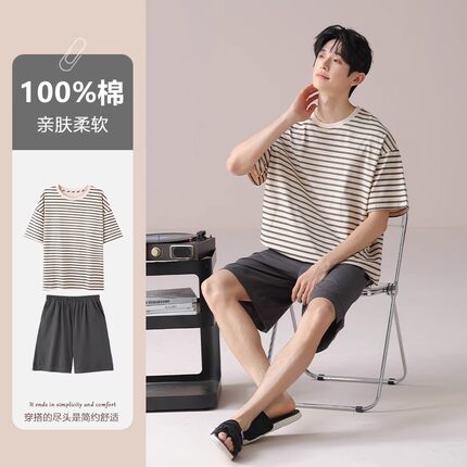 男士睡衣夏季纯棉薄款短袖2025年新款条纹高级感可外穿家居服套装