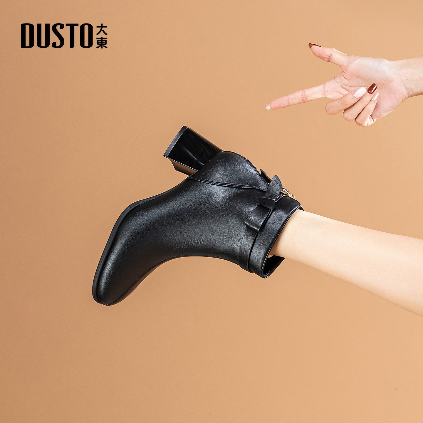 大东女靴时装靴2025冬季新款时尚后拉链粗跟圆头加绒保暖短靴女
