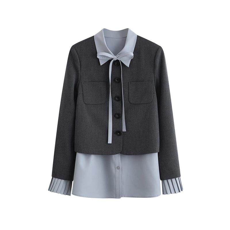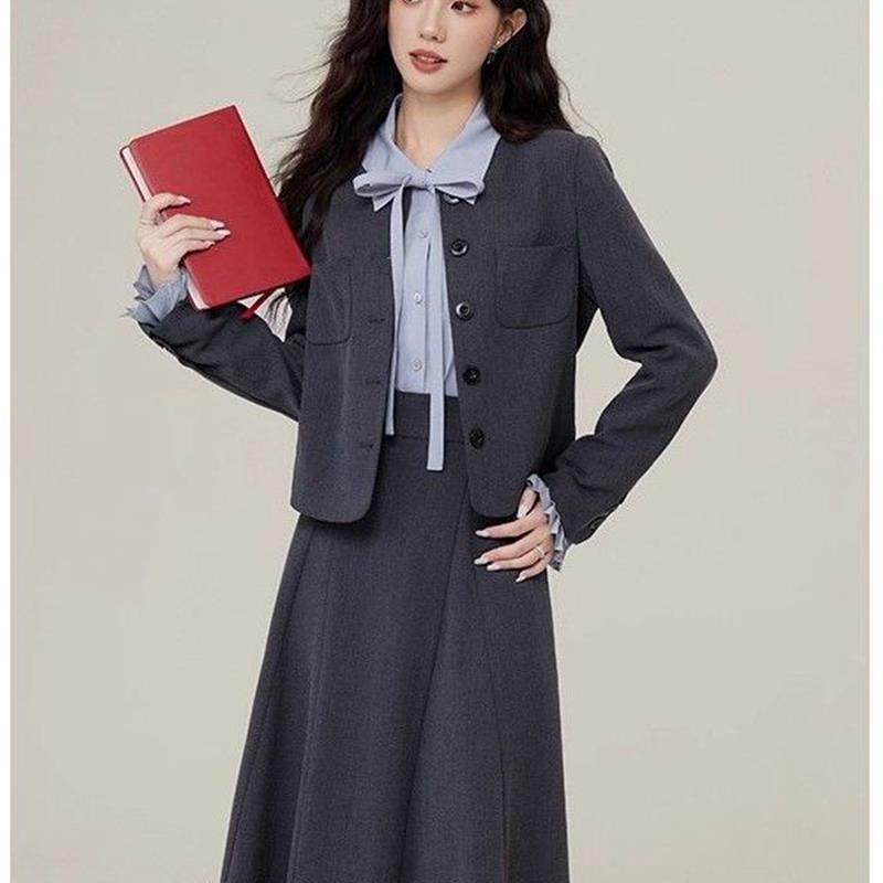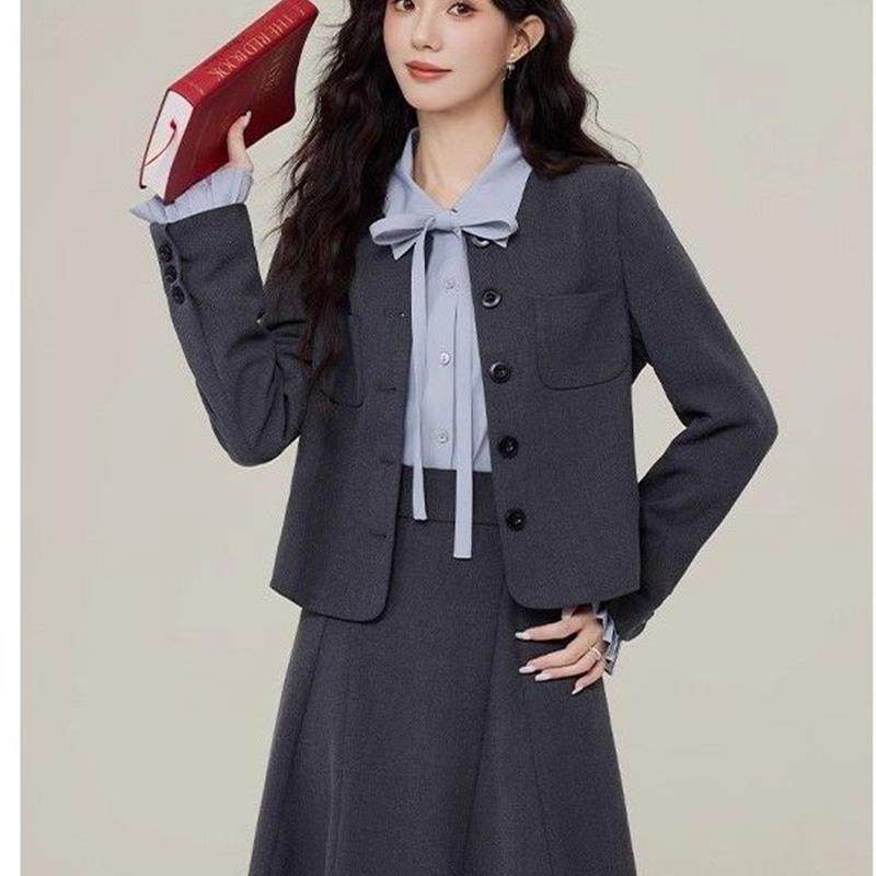 灰色西装套装女秋季新款小个子通勤面试正装休闲西服百褶裙两件套