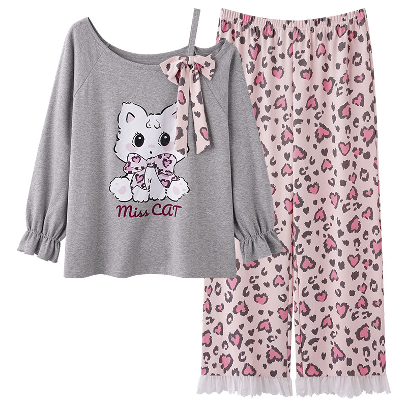 都市丽人纯棉睡衣女款春秋季长袖单肩性感豹纹2026新款家居服套装