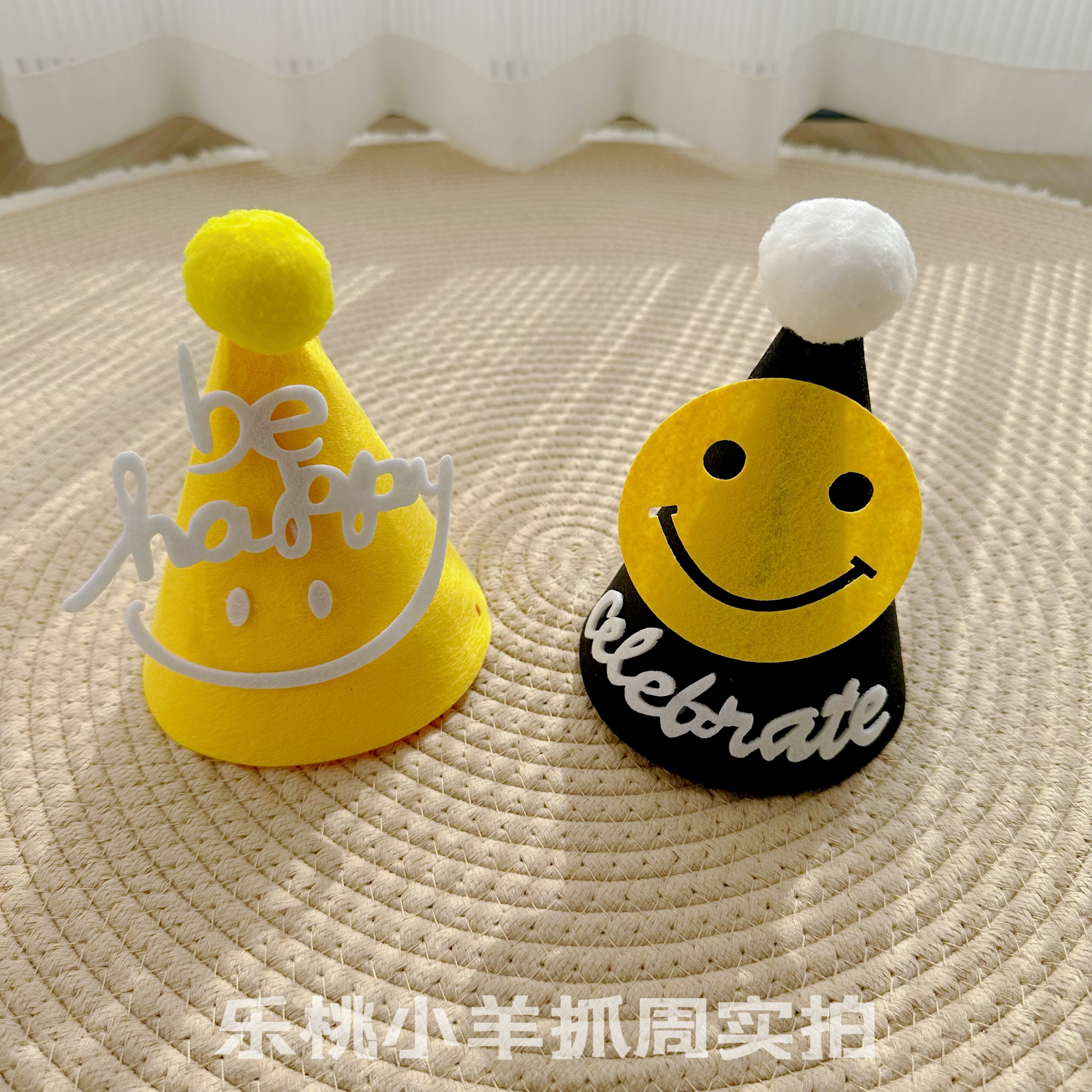 宝宝周岁生日帽卡通可爱ins风蝴蝶结笑脸毛毡棉麻1岁装饰布置用品